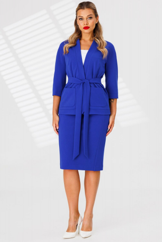 Платье выполнено из креп-атласа с принтом. Платье Х-образного силуэта, отрезное по линии талии, длиной миди. Перед выполнен "на запах" со складками по линии талии. Спинка цельная. Вырез V-образной формы. Рукав втачной, одношовный, с напуском. Низ рукава собран на эластичной тесьме. Юбка расширена к низу. Платье на отлетной по низу атласной подкладке. В комплект входит съемный ремень с обтяжной пряжкой.