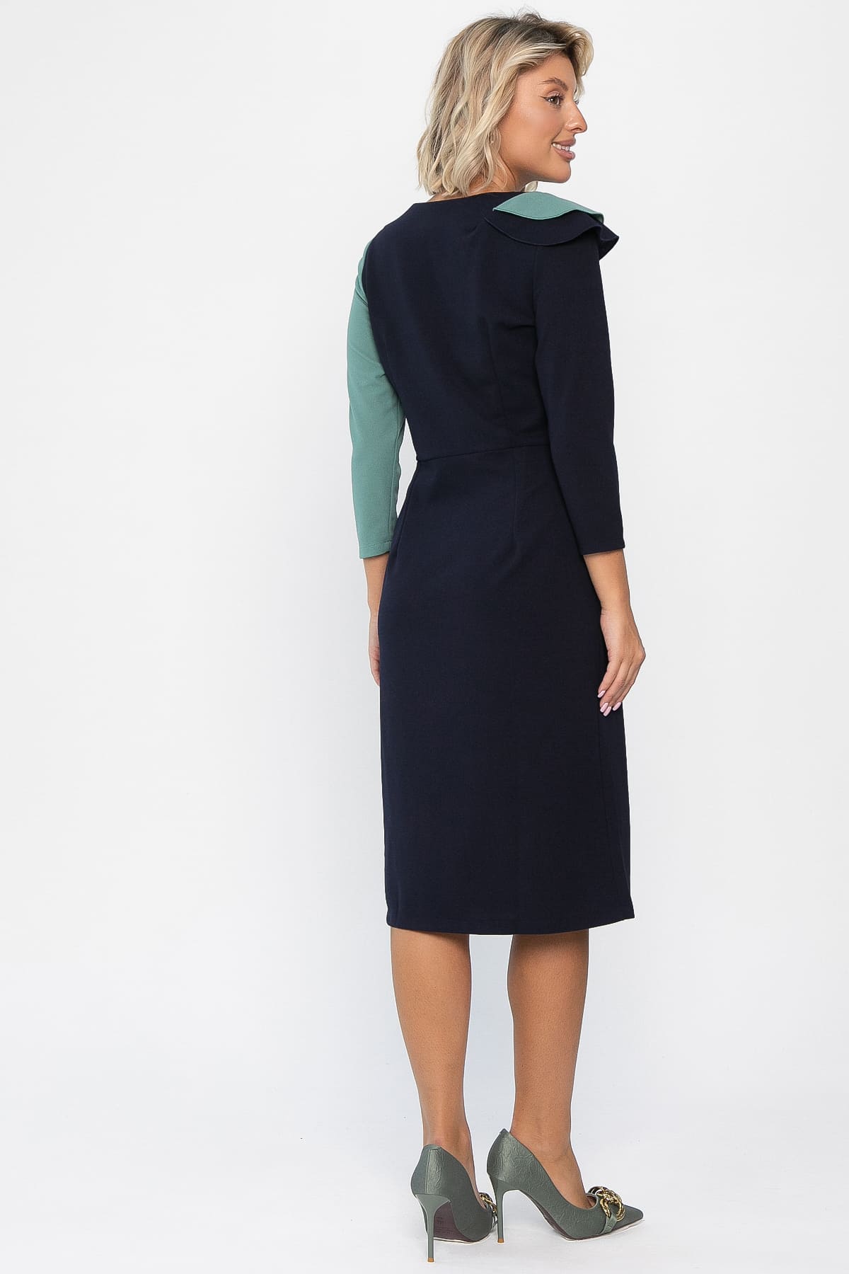 Роскошное платье, спереди комбинированное из двух цветов создающая свою уникальность, за счет двойного волана на лифе. Модель имеет рукава 3/4 и может стать достойным повседневным нарядом на осень и зиму для девушек, любящих выглядеть элегантно в любой ситуации – на вечеринке и на работе.