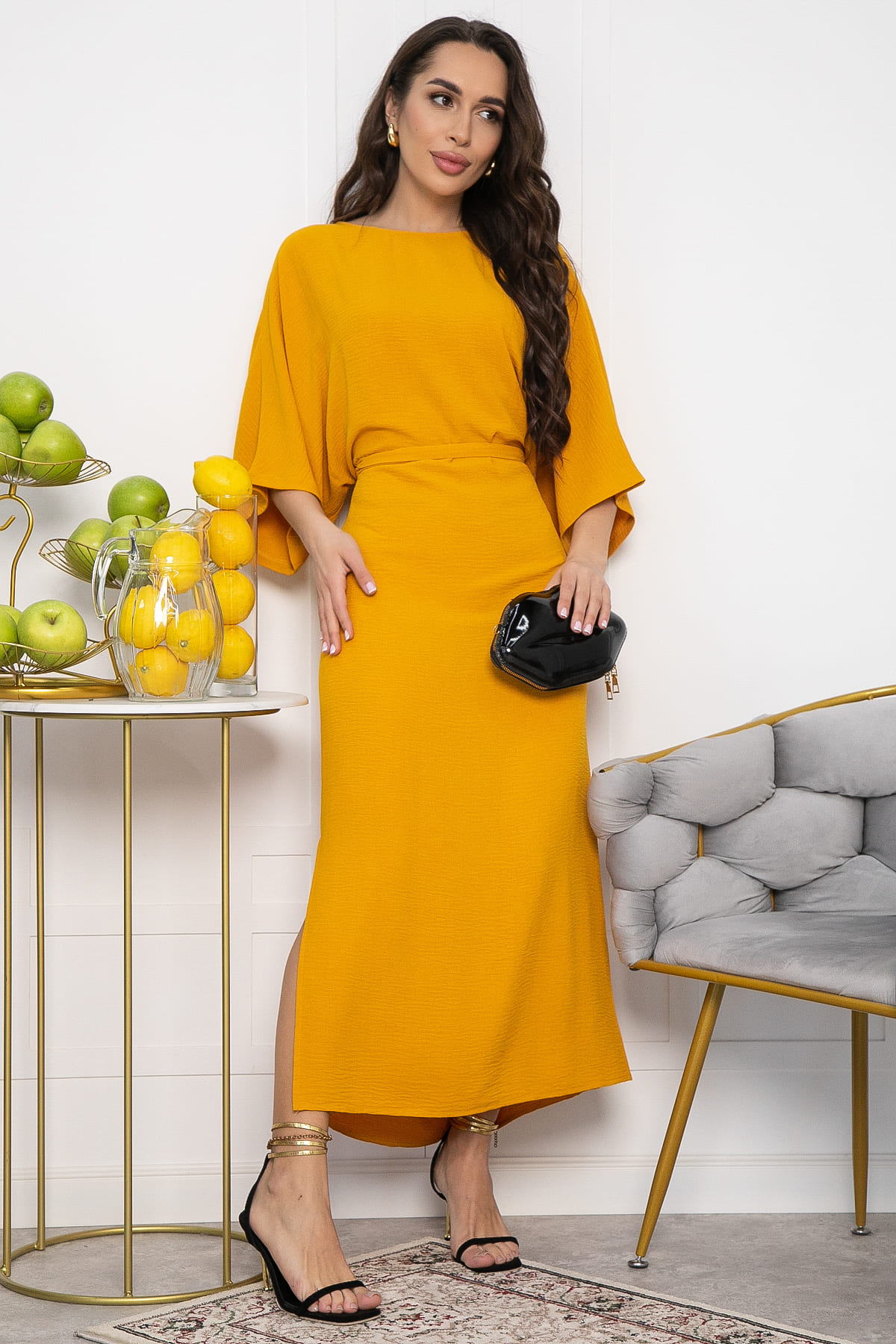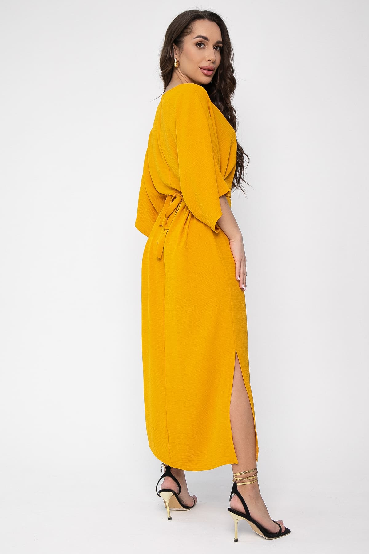 Создайте свой идеальный летний образ с этим платьем! Платье в горчичном оттенке и современным кроем станет вашим верным спутником в жаркие дни. Оно не только стильно выглядит, но и обеспечивает комфорт благодаря цельнокроеным спущенным рукавам и разрезам по бокам. Пояс на талии вшитый по бокам, подчеркнет вашу индивидуальность и придаст образу завершенность.