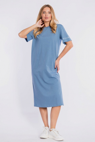 Платье женское выполнено из хлопка двух расцветок. Короткие рукава, горловина и низ изделия с планками. Спереди нанесён принт.