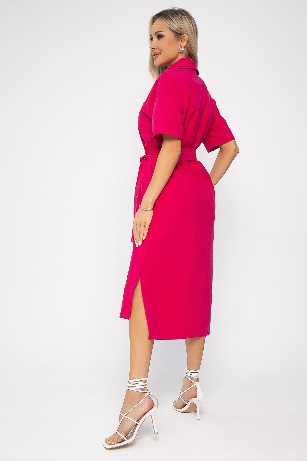 Создайте легкий и стильный образ с помощью нашего платья-рубашки! Эта модель прямого кроя средней длины станет универсальным элементом вашего гардероба. Оригинальный асимметричный крой с более коротким передним полотнищем добавляет образу изюминку и динамику. Спущенное плечо и короткие рукава придают расслабленный вид. Классический воротник на стойке рубашечного типа переходит в планку, подчеркивающую элегантность модели. Удобная застежка на пуговицах по всей длине платья обеспечивает комфорт. Потайные карманы по бокам и накладной карман с одной стороны добавляют функциональности. В комплекте идет пояс из основной ткани, который позволяет подчеркнуть талию и создать более женственный силуэт.