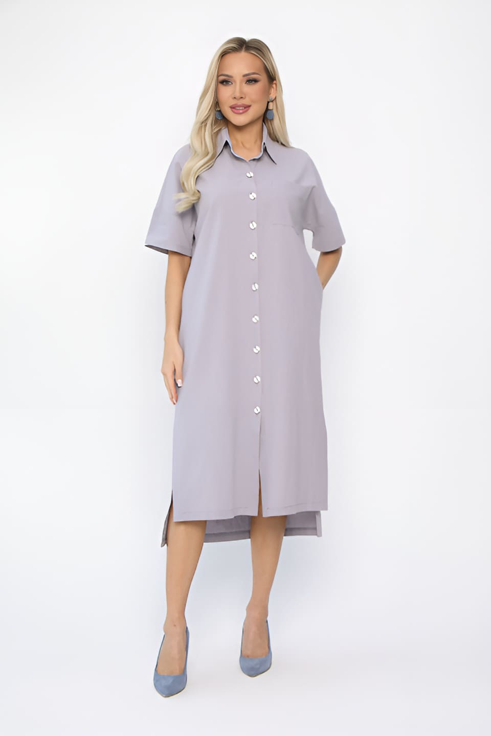 Создайте легкий и стильный образ с помощью нашего платья-рубашки! Эта модель прямого кроя средней длины станет универсальным элементом вашего гардероба. Оригинальный асимметричный крой с более коротким передним полотнищем добавляет образу изюминку и динамику. Спущенное плечо и короткие рукава придают расслабленный вид. Классический воротник на стойке рубашечного типа переходит в планку, подчеркивающую элегантность модели. Удобная застежка на пуговицах по всей длине платья обеспечивает комфорт. Потайные карманы по бокам и накладной карман с одной стороны добавляют функциональности. В комплекте идет пояс из основной ткани, который позволяет подчеркнуть талию и создать более женственный силуэт.