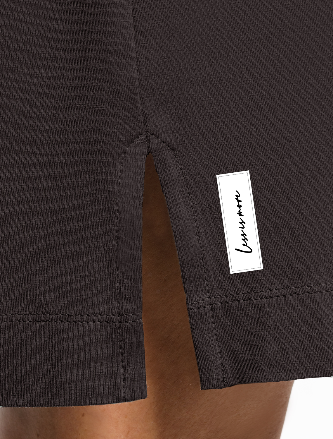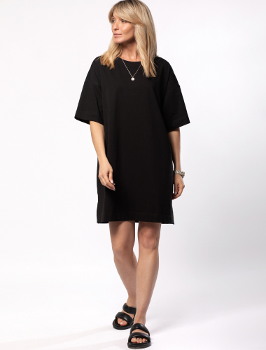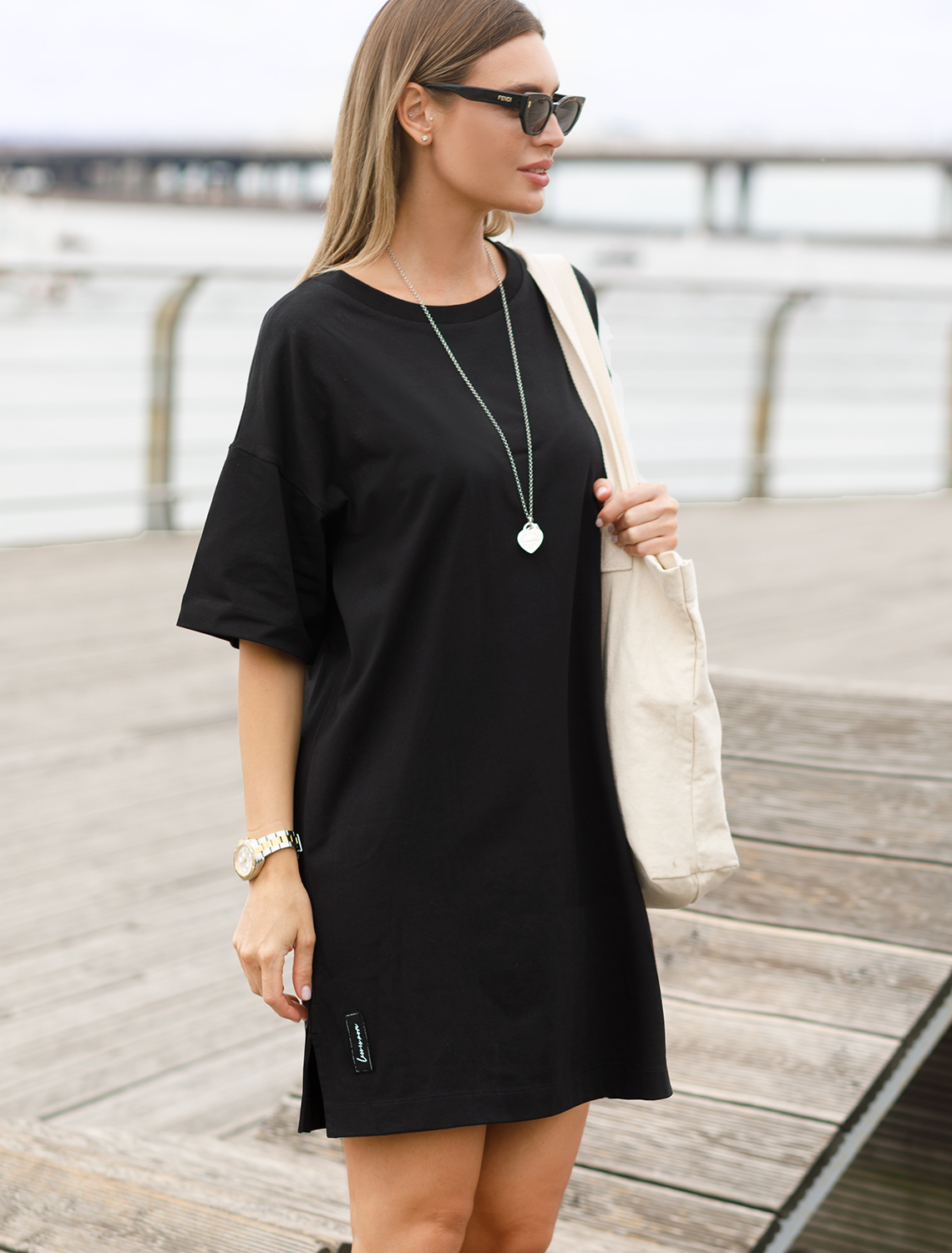 Платье-футболка выполнено из премиального хлопка. Наличие эластана в составе изделия способствует формоустойчивости и меньшей сминаемости. Свободный крой подходит для любой фигуры. Изделие украсили нашивкой снизу и металлическим логотипом бренда. 2 в 1 можно носить как платье или как удлиненную футболку с леггинсами или джинсами.