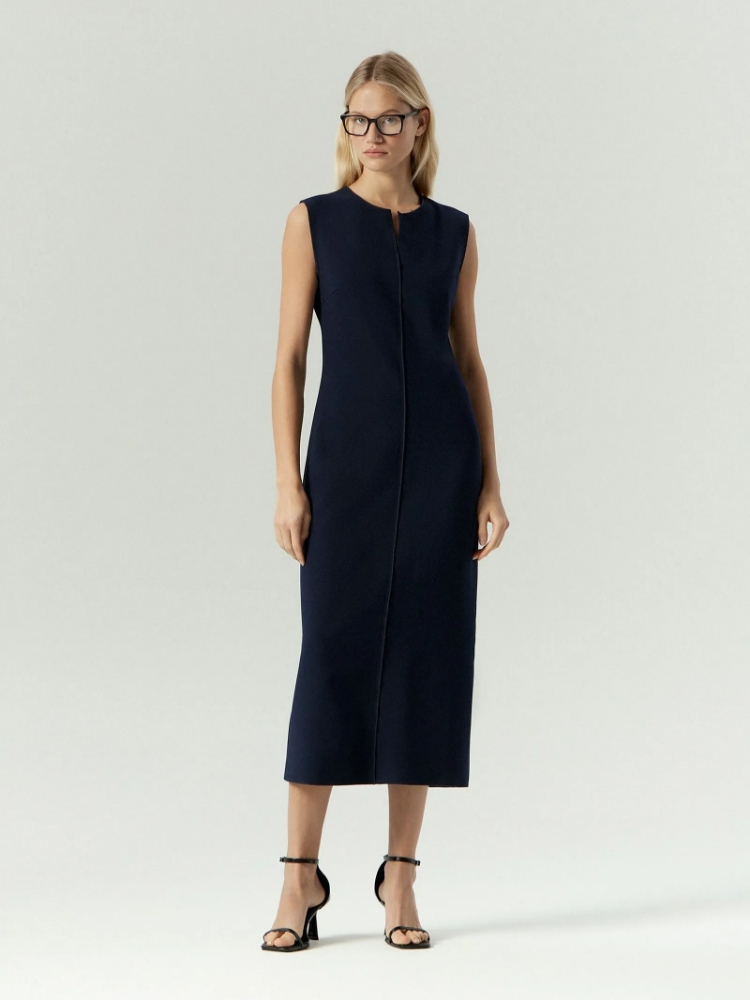 Платье-футляр из костюмной ткани в синем цвете станет отличным вариантом на каждый день. За счёт добавления эластана материал тянется и комфортно садится, а высокое содержанием вискозы делает его приятным к телу. Приталенную модель без рукавов отличает акцентный шов. Модель выполнена в длине мидакси, которая не теряет актуальности и подходит к любому случаю