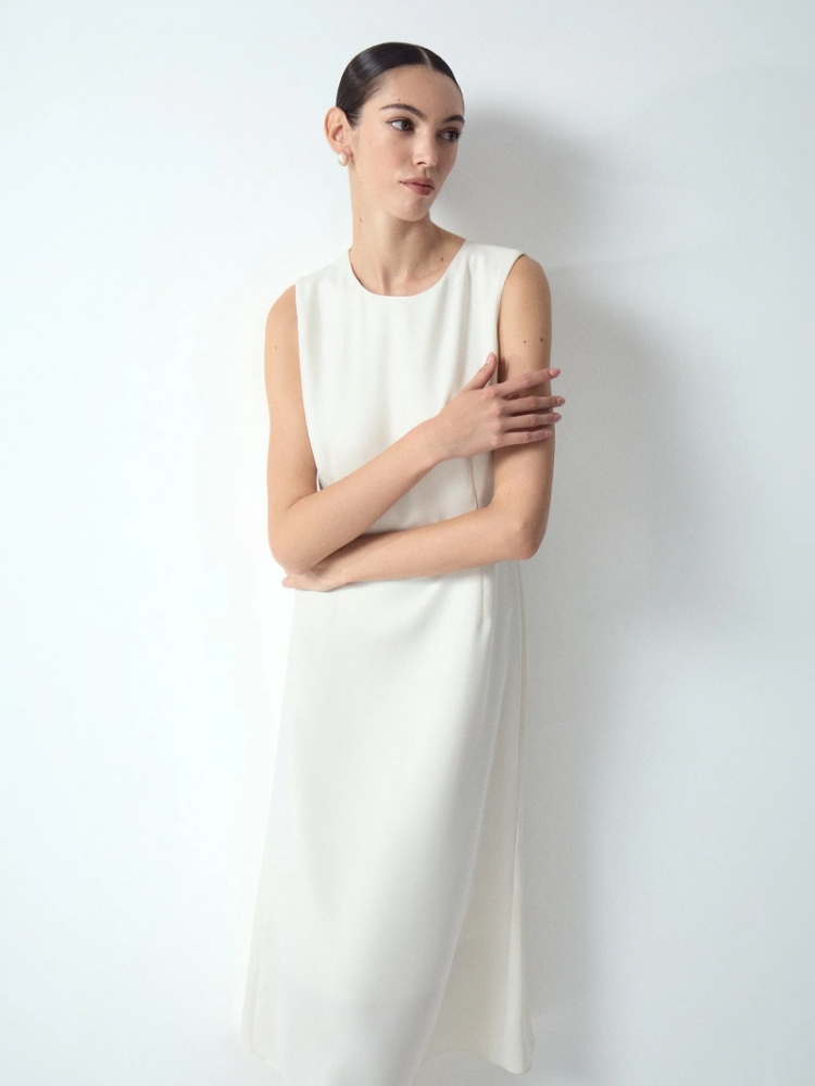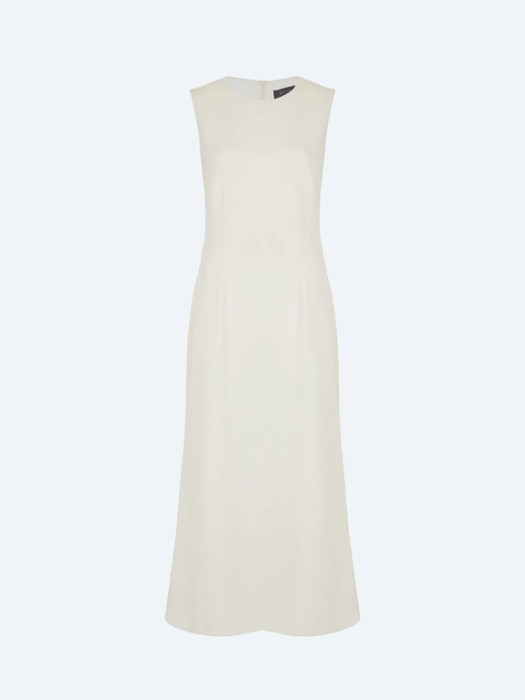 Лаконичное платье в молочном цвете выполнено из костюмного материала и составит безупречный выходной или деловой образ в паре со смокингом из комплекта. Платье идеально для делового гардероба. Модель без рукавов с круглым вырезом имеет актуальную длину миди, приталенный крой и изящные вытачки. Застёгивается на молнию сзади. Выполнено на подкладке