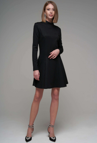 Платье полуприлегающего силуэта, расклешенное к низу. Перед и спинка с рельефами от проймы. В среднем шве спинки обработана потайная молния. Рукав втачной одношовный. Воротник стойка. Фурнитура может быть изменена, сохраняя целостность художественного замысла. Длина спинки по среднему шву-85см, длина рукава-61см.