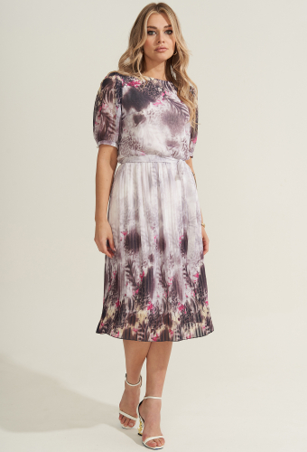Платье прямого силуэта, отрезное по линии талии и приталенное с помощью резиночки, с юбкой плиссе. Перед с нагрудной вытачкой. В боковых швах шлевки. Горловина круглая, по спинке застежка капелька на одну петлю-пуговку. Рукав втачной со сборкой по окату и по низу с притачной манжетой с застежкой на одну петлю- пуговку. Платье на подкладке. Платье дополнено поясом из основной ткани.