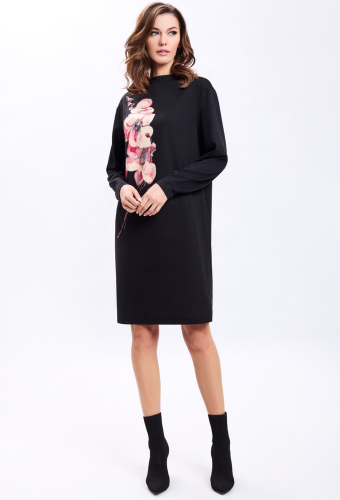 Платье прямого силуэта со слегка спущенной линией плеча. Рукав втачной одношовный. Воротник небольшая цельнокроенная стойка. Длина по середине спинки -99 см, длина рукава-58 см. Фурнитура может быть изменена, сохраняя целостность художественного замысла.
