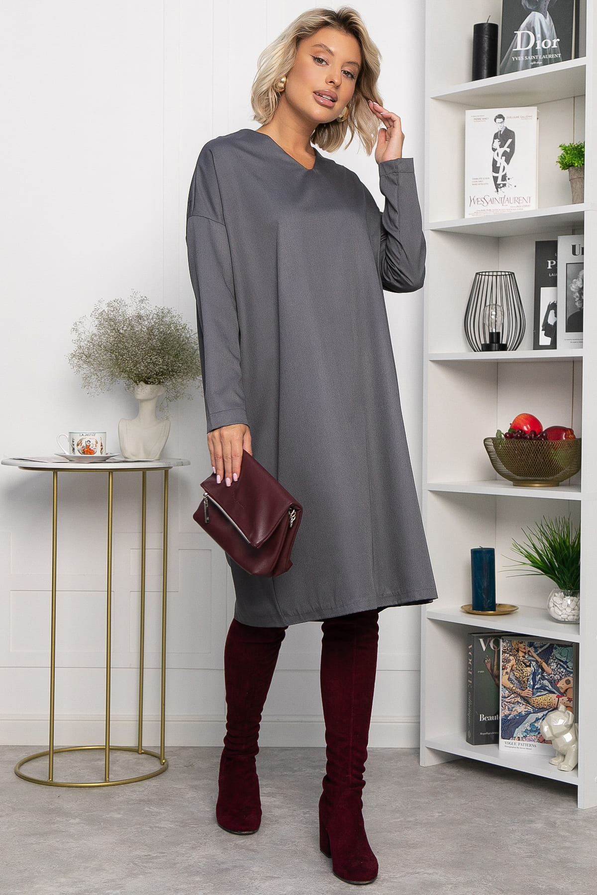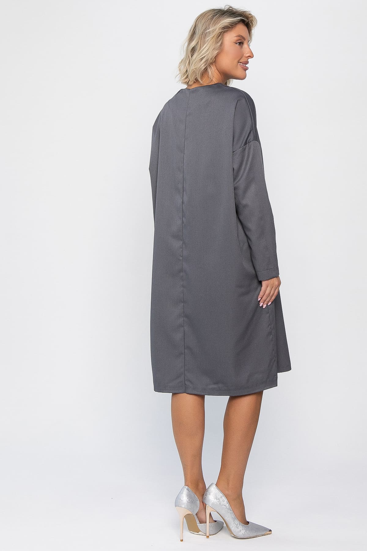 Серое свободное платье прямого кроя прекрасно подойдет для повседневной носки и деловых встреч. Модель выполнена из приятного материала, подчеркивающего элегантность и комфорт. Талия легко акцентируется поясом или ремнем (не входят в комплект). Длинный рукав и V-образная горловина добавляют утонченности облику. Универсальное решение для тех, кто ценит простоту и стиль одновременно.