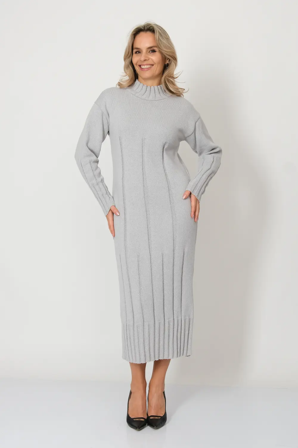 Трикотажное, однотонное платье-свитер прямого силуэта с воротником-стойка.  Длинные рукава с приспущенным плечом. Вертикальный узором визуально вытянет Ваш силуэт. Материал с добавлением шерсти согреет в холодные дни. Длина миди – классика, которая будет актуальна всегда. Горло эластичное, не будет давить и мешаться, при этом будет согревать. Если вы любите удобные, теплые наряды на каждый день, то эта модель для Вас.