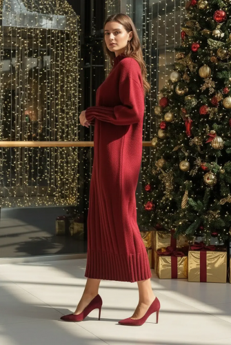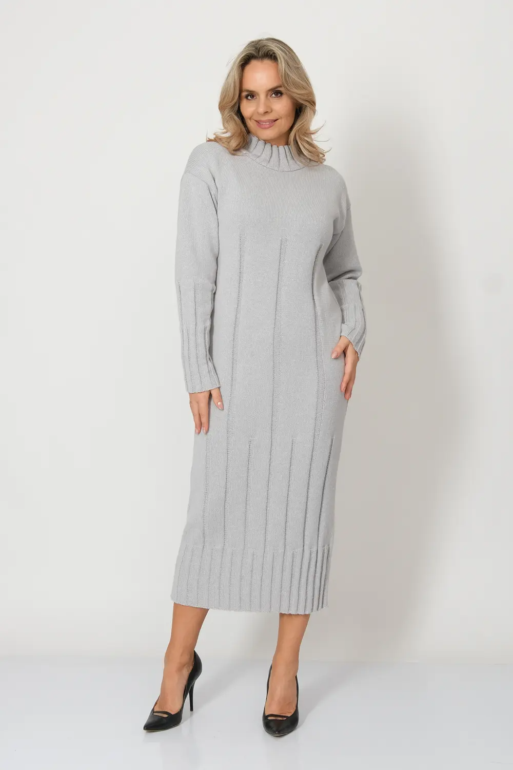 Трикотажное, однотонное платье-свитер прямого силуэта с воротником-стойка.  Длинные рукава с приспущенным плечом. Вертикальный узором визуально вытянет Ваш силуэт. Материал с добавлением шерсти согреет в холодные дни. Длина миди – классика, которая будет актуальна всегда. Горло эластичное, не будет давить и мешаться, при этом будет согревать. Если вы любите удобные, теплые наряды на каждый день, то эта модель для Вас. св.серый