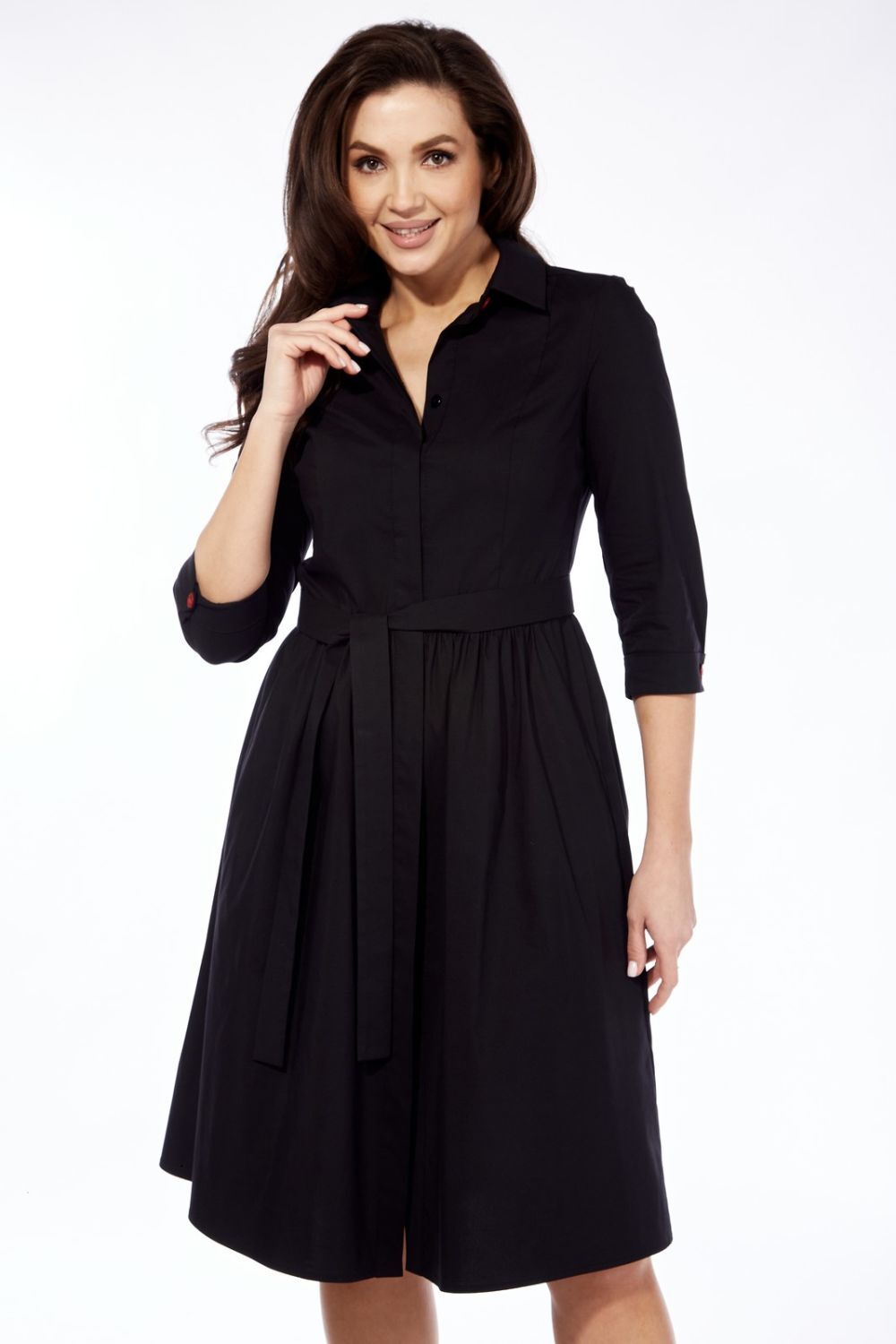 Элегантное женское платье полуприлегающего силуэта, классической длины, отрезное по линии талии со сборкой, изготовлено из натуральной хлопковой ткани. Горловина оформлена рубашечным воротником со стойкой, центральная потайная застежка планки на петли-пуговицы. Перед изделия с рельефами в верхней части и боковыми карманами по юбке, спинка с талиевыми вытачками. Рукава с цельнокроеным манжетом и декоративными пуговицами контрастного цвета. Можно снять пуговицы и ширина рукава по низу увеличится на 3см. В комплекте идет пояс из основной ткани. Платье без подкладки. Модель платья универсальна, его уместно надеть как на работу в офис, так и на праздничное мероприятие. Платье будет комфортно для любого типа фигуры. Длина рукава – 44см, длина изделия – 103см