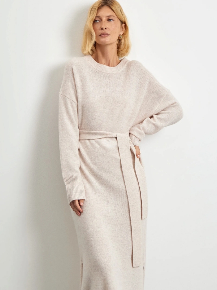 Уютное трикотажное платье молочного цвета из шерсти мериноса. Дополнено поясом в тон. Свободную модель прямого кроя отличают удлинённый рукав cо спущенным плечом и комфортная круглая горловина. Платье длины макси имеет разрезы внизу для свободы шага