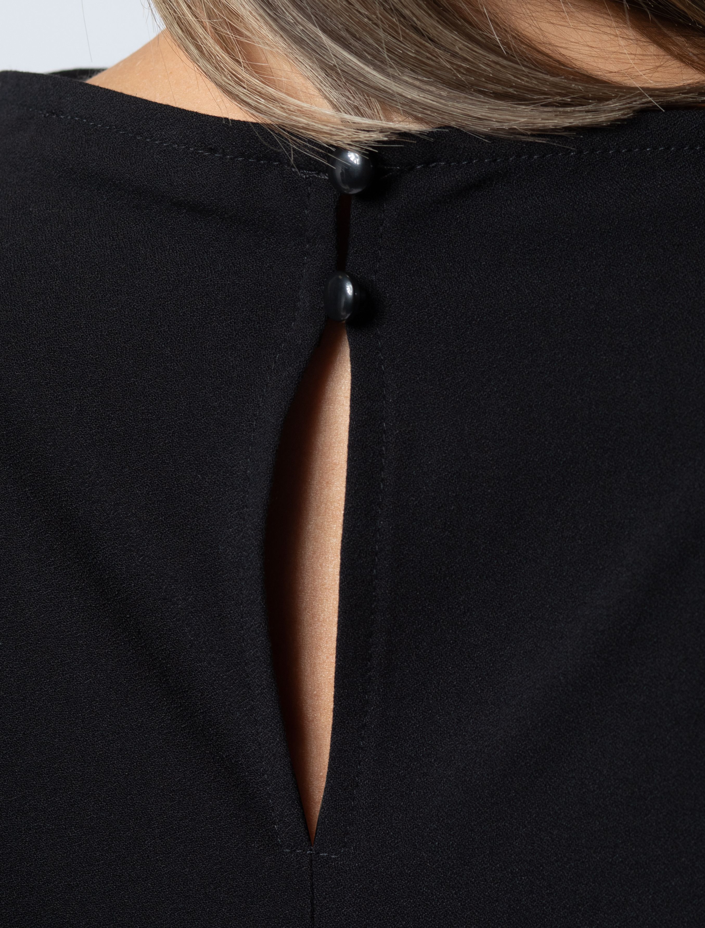 Лаконичное платье сшито из эластичного крепа. Достаточно сдержанный вырез горловины хорошо комбинирует с цельнокроеным рукавом и мягкой драпировкой на плече. На спинке застежка из двух пуговиц. Ткань почти не мнется и хорошо держит форму. В подарок идет ремешок из эко-кожи. черный
