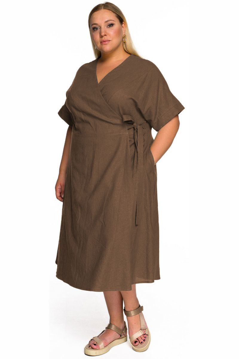 Кофе Классическое городское платье с запАхом из льна, отрезное по линии талии. Линия плеча спущена и заканчивается планочкой.