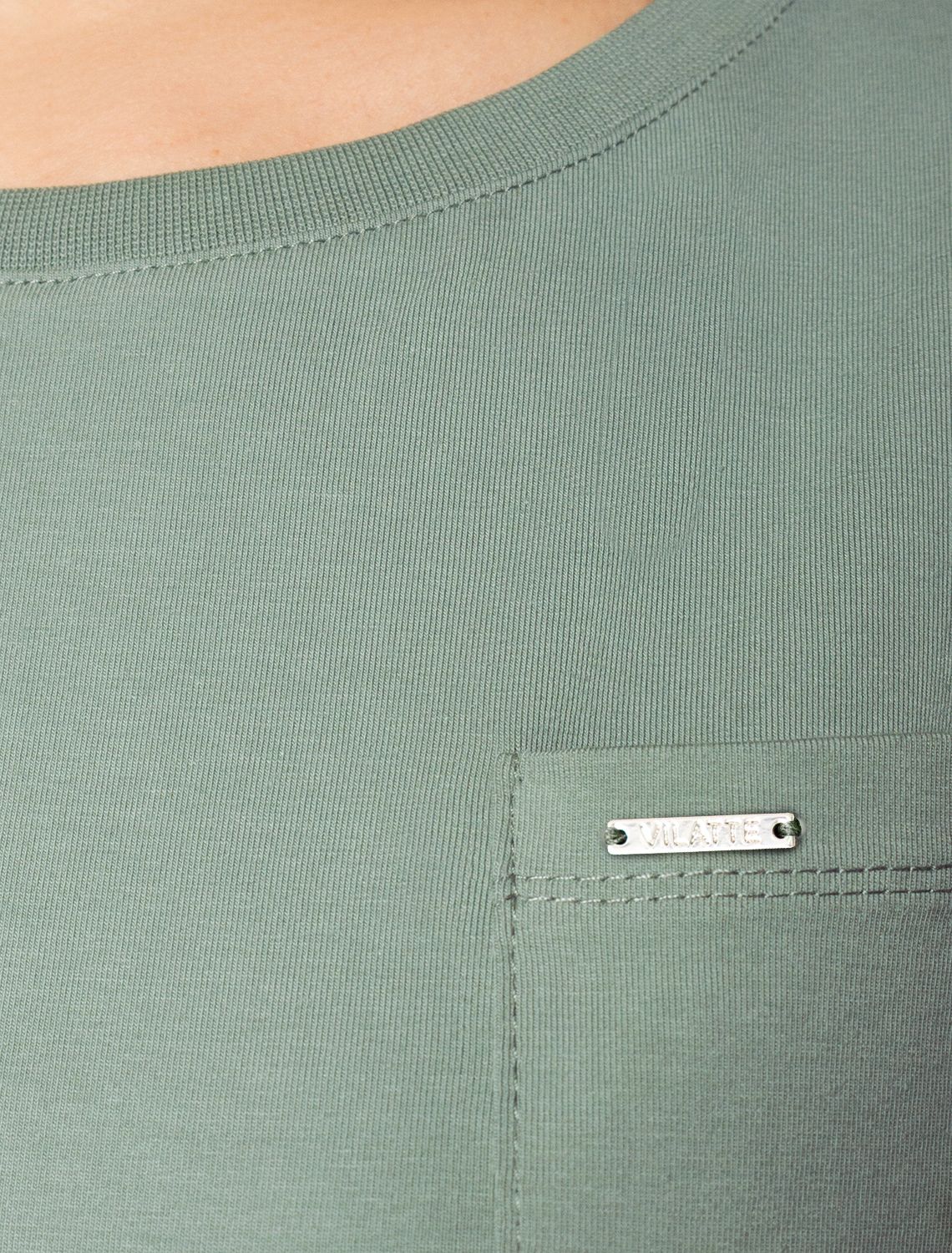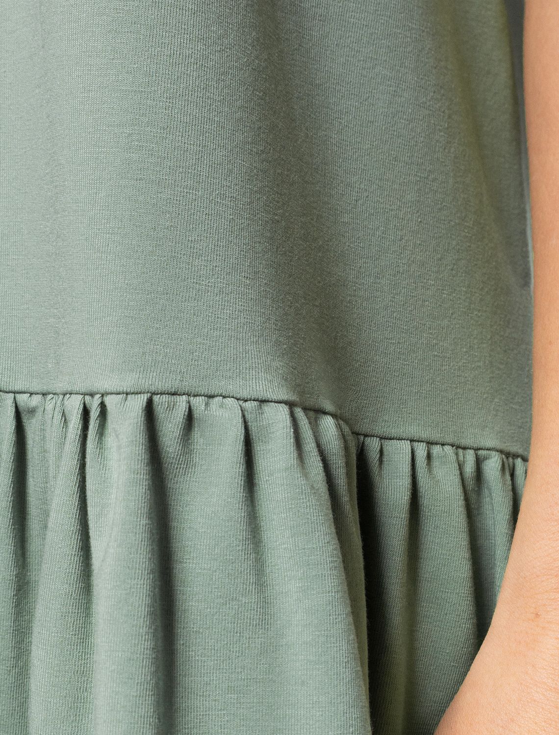 Платье выполнено из премиального хлопка. Трендовый верх как у футболки с карманом, задает лаконичный стиль, а пышный низ вносит в образ романтичный дух. За счет эластана в изделии очень комфортно. Подходит для любой фигуры. Изделие дополнено металлическим логотипом бренда. св.оливковый
