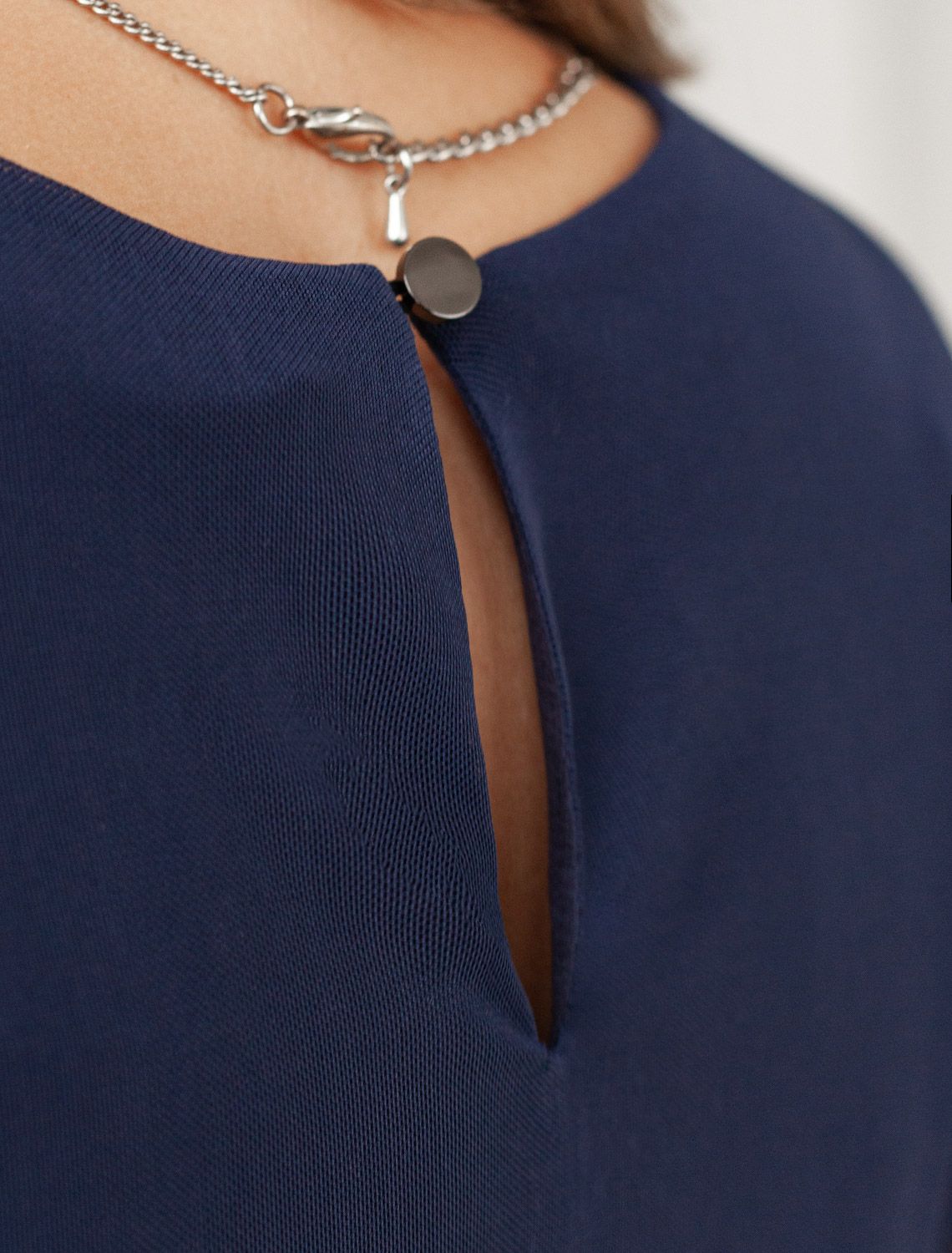 Модель выполнена из воздушной сетчатой ткани с вискозной подкладкой, которая подчеркивает фигуру. Прямой крой создает стройный силуэт. Богатый темно-синий цвет создает эффект глубины и роскоши. Прозрачные рукава добавляяют образу пикантности. Идеально подходит как для вечерних выходов, так и для повседневного образа.