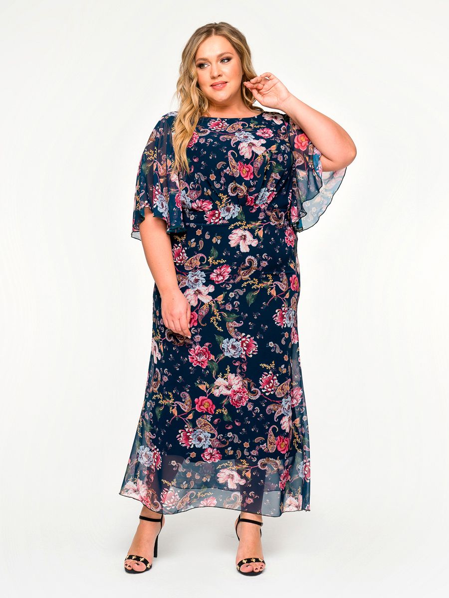 Мультиколор Платье из принтованого шифона с летяшим рукавом позволит каждой даме создать образ изысканный и неповторимый. Платье такого кроя удачно прячет имеющиеся особенности фигуры, подчеркивая  женственность
