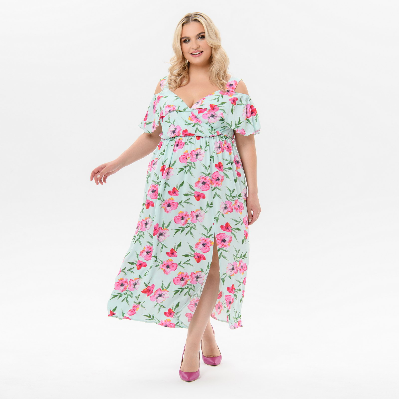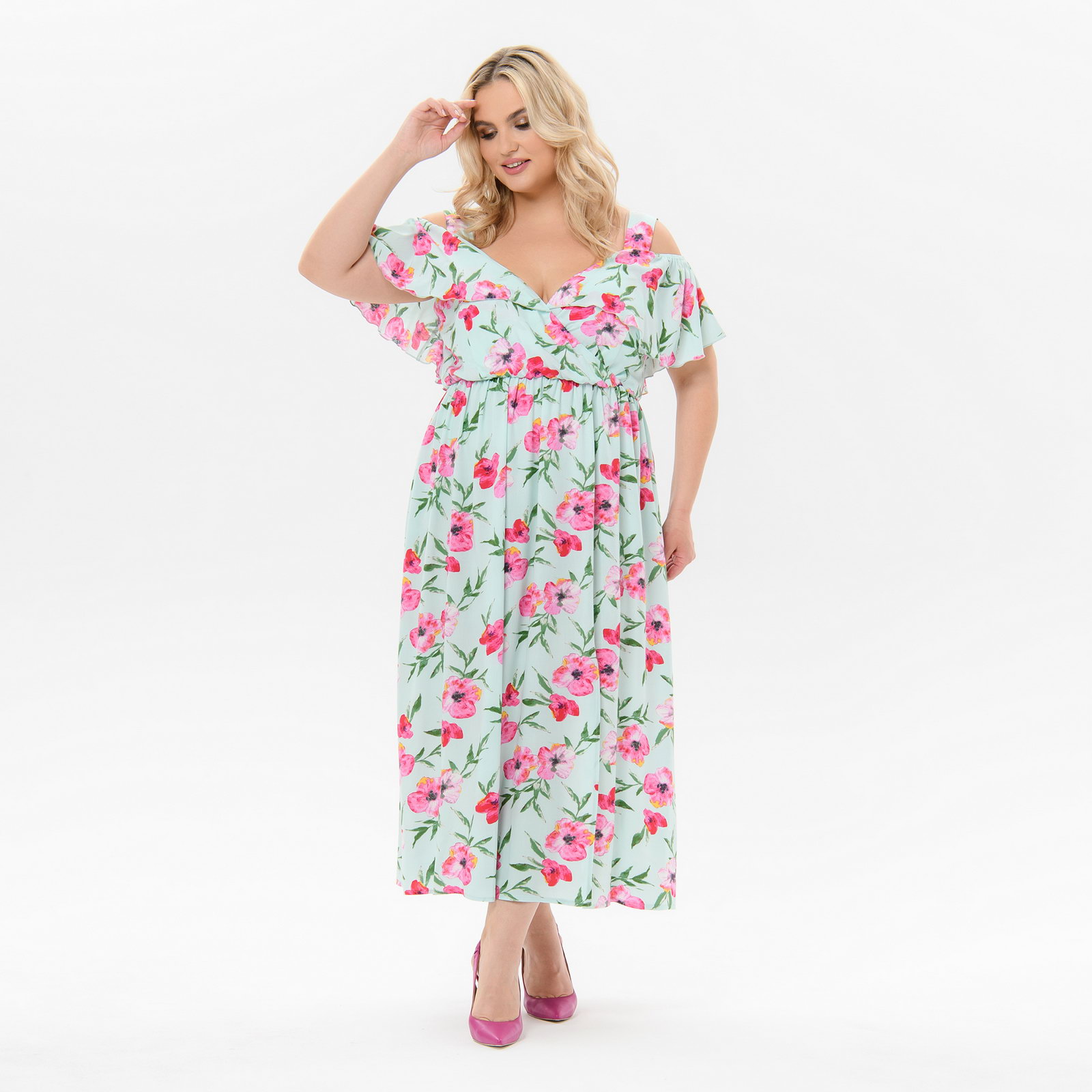 Платье из штапеля с "крылышком" по лифу, принт "маки"