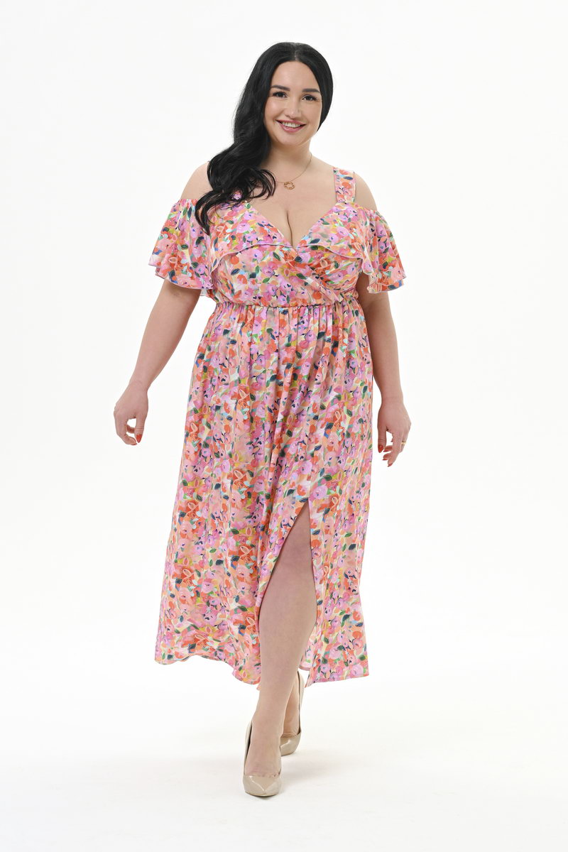 Воздушное платье-сарафан из 100% вискозы. Верхняя часть отрезная, с запАхом, на бретелях (ширина бретели 4 см), конструктивно продумана и ненавязчиво открывает зону декольте. По вырезу горловины переда и спинки втачан волан, на уровне руки переходящий в "крылышко".  По шву соединения юбки с лифом резинка, не стесняющая движений, но одновременно прорисовывающая линию талии.