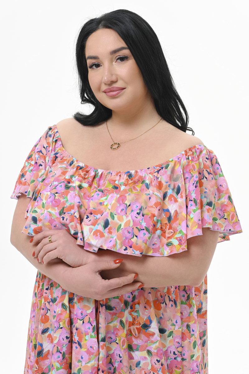 Летнее длинное платье из принтованного штапеля с воланом по верху. Линия горловины переда и спинки расширена, собрана на резинку вместе с воланом.