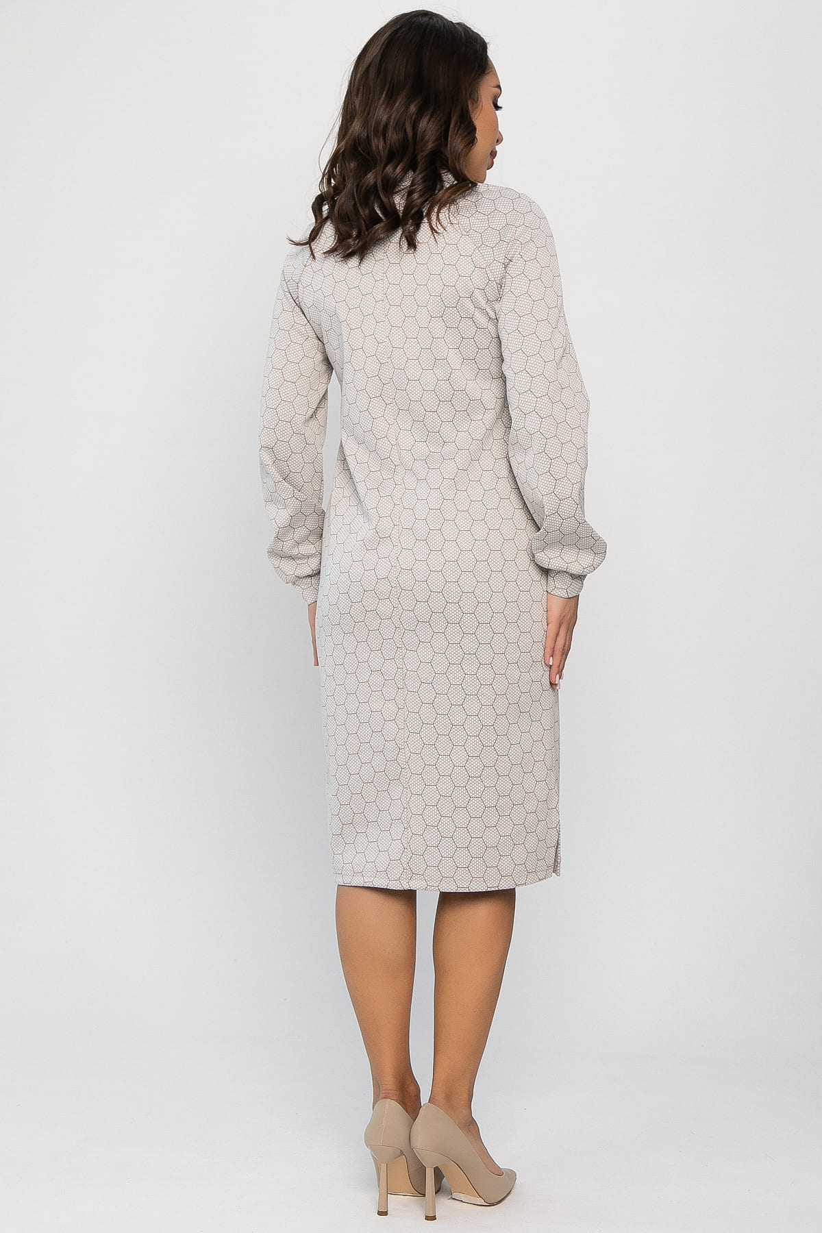 Принт в минималистичном стиле на спокойном бежевом фоне придаёт образу особую изысканность. Платье легко сочетается с различными аксессуарами и обувью.