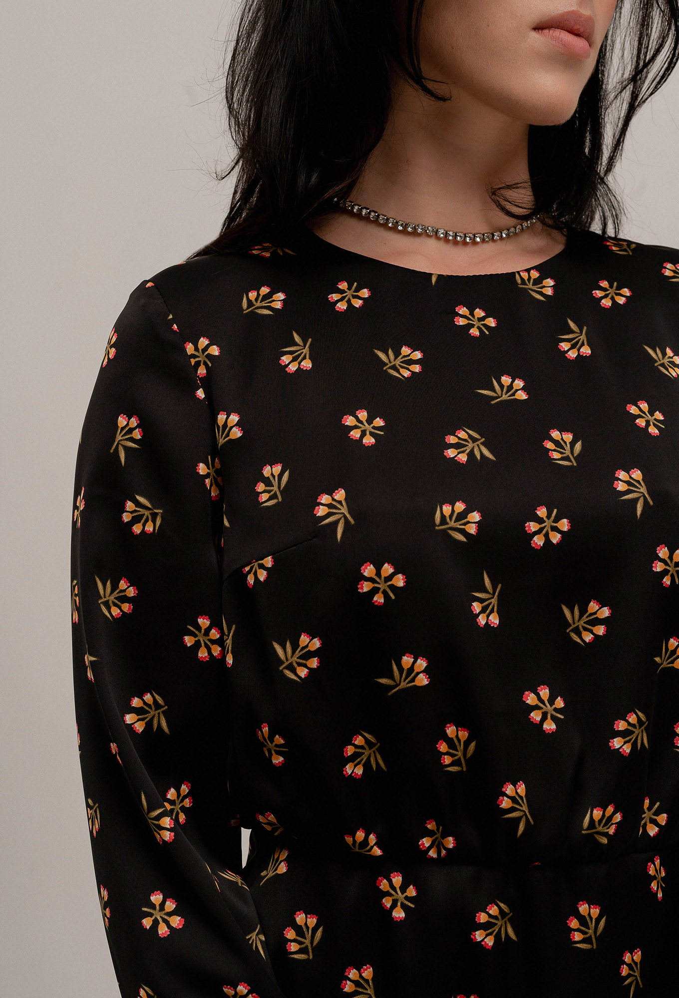 Платье женское из ткани шелк иск. с печатным рисунком на подкладке.Приталенного силуэта, рукав рубашечного типа длиной до запястья.Перед со сборкой по линии талии и по спинке по лифу.Отрезное по линии талии,с застежкой молнией в среднем шве спинки.