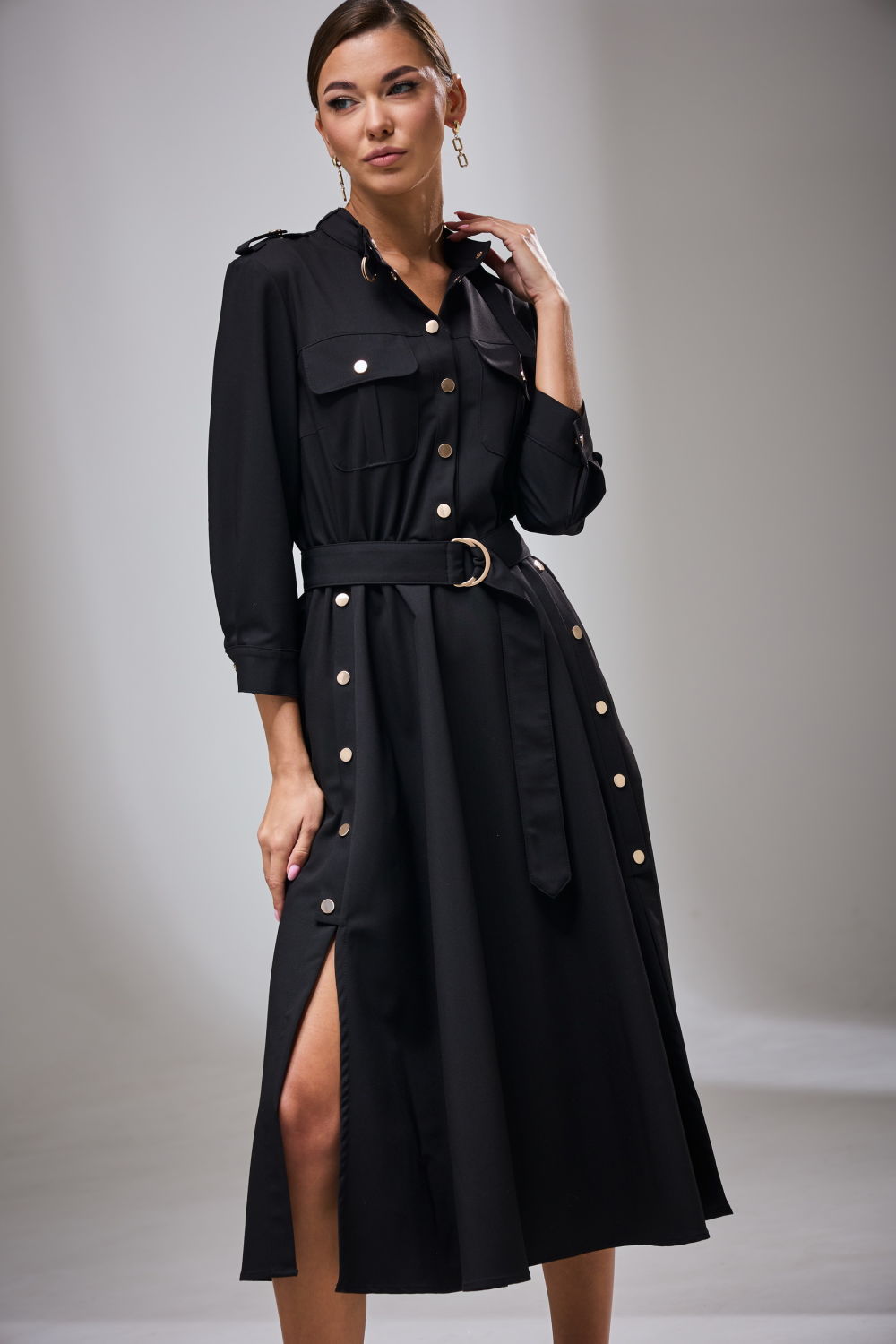 Платье женское полуприлегающего силуэта, отрезное по линии талии. По переду лифа застежка притачными планками на кнопки, накладные карманы с клапаном, застегивающиеся на кнопку. Горловина округлой формы, обработана стойкой со шлевками, в которых расположен деоративный поясок с полукольцами. На плечевых швах расположены декоративные паты с кнопкой. Рукав ¾, одношовный, с притачной манжетой. По переду юбки два разреза с планками, застегивающимися на кнопки.  Платье комплектуется съемным поясом с полукольцами, выполненным из основной ткани. Декоративные элементы и фурнитура могут отличаться от заявленных на фото.