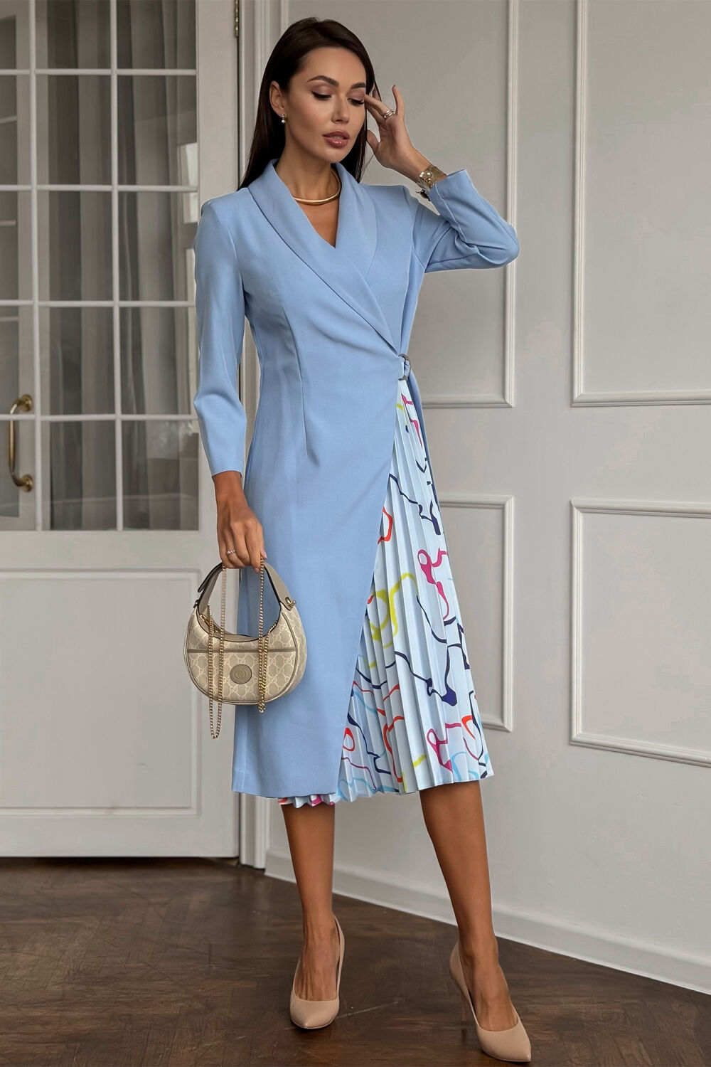 Платье женское из двух видов ткани (1) 69% ПЭ, 27% вискоза, 4% спандекс;  (2)98 % ПЭ, 2% лайкра), полуприлегающего силуэта. Перед комбинированный на запах с поясом. По переду нагрудные и талиевые вытачки. Горловина обработана воротником шалевого типа. Передняя половина юбки выполнена из ткани-компаньона с радиальным гофрированием. В боковом шве справа потайная молния. В области талии слева расположен притачной пояс из основной ткани, завязывающийся на полукольца. Спинка цельнокроеная с плечевыми и талиевыми вытачками. Рукав 7/8 втачной одношовный.. Цвет материала может отличаться по тону в зависимости от настроек вашего монитора!