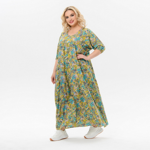 Мультиколор Платье длинное из штапеля свободного силуэта. Отрезное по линии груди, нижняя часть платья присборена. Рукав закрывает локоть, низ рукава на резинке. Вырез горловины округлый.