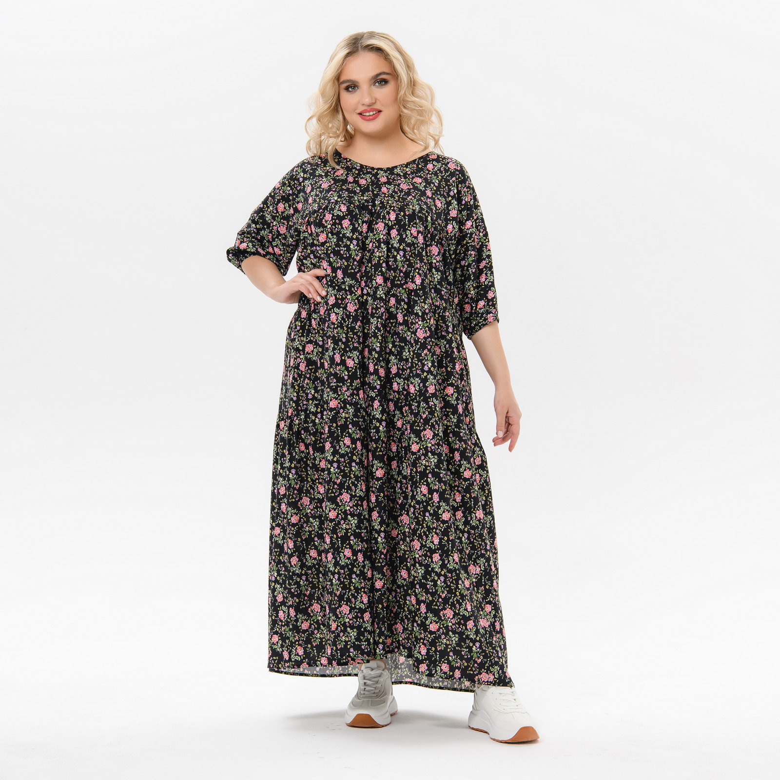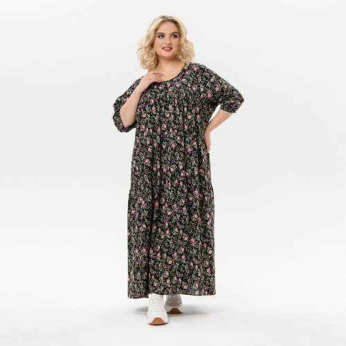 Мультиколор Платье длинное из штапеля свободного силуэта. Отрезное по линии груди, нижняя часть платья присборена. Рукав закрывает локоть, низ рукава на резинке. Вырез горловины округлый.