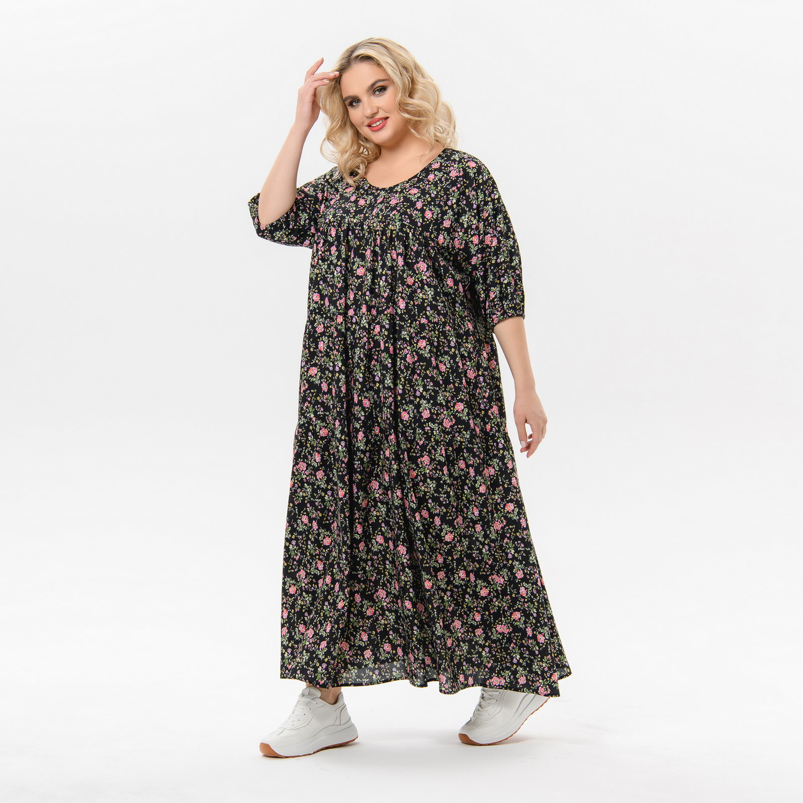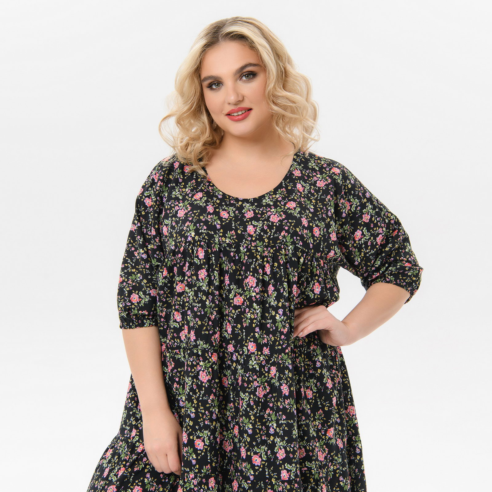 Платье каскадное, штапель, принт "мелкие цветочки на черном"