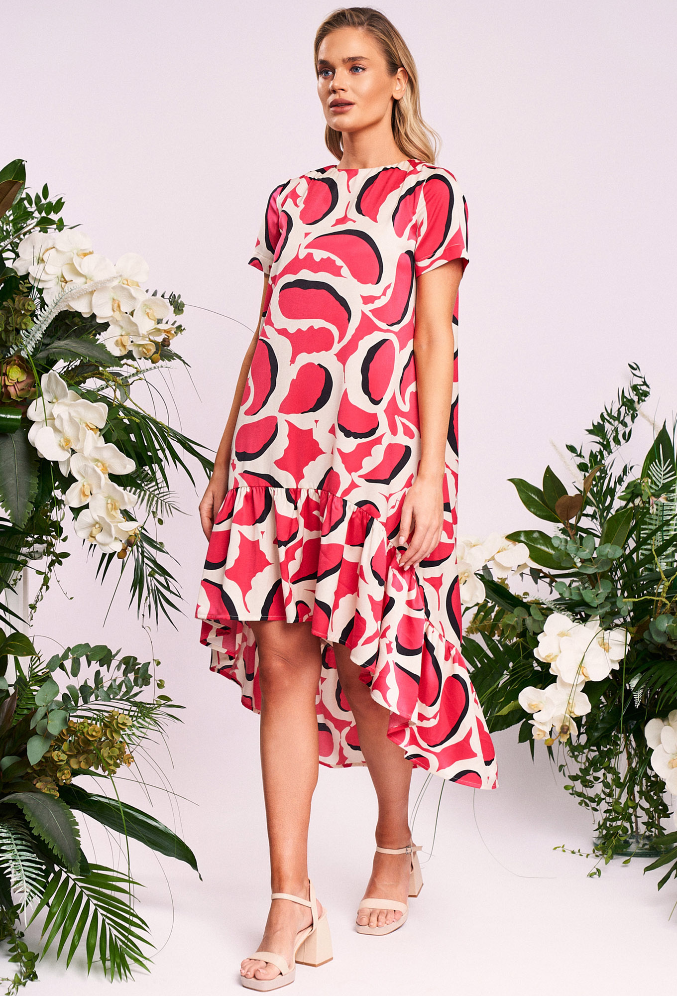 Очаровательное женское платье, умеренного объема. Спинка с углубленным вырезом горловины и завязками на бант. Рукав втачной, короткий. Низ платья фигурной формы: перед короче - до линии колена; спинка длиннее- до середины голени.Платье с притачным воланом на сборке.