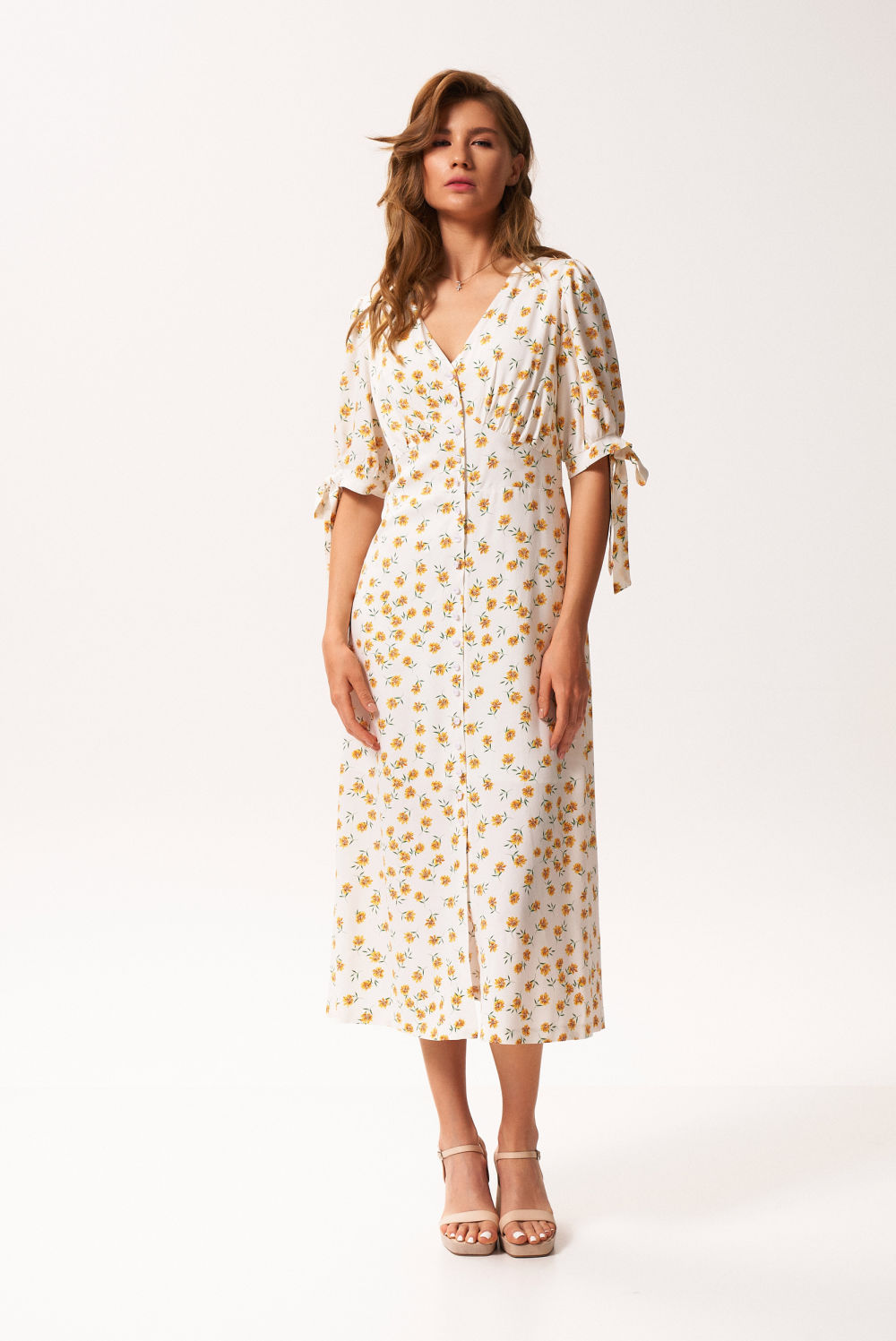 Нежное женское платье прилегающего силуэта, отрезное по линии талии. Перед с фигурной кокеткой и сборкой под грудью. Юбка конической формы длиной ниже линии колена. Вырез горловины глубокий, V-образный. Рукав втачной со сборкой по линии оката и низу. Манжет притачной с завязкой на бант. Платье с застежкой на петли и пуговицы.
