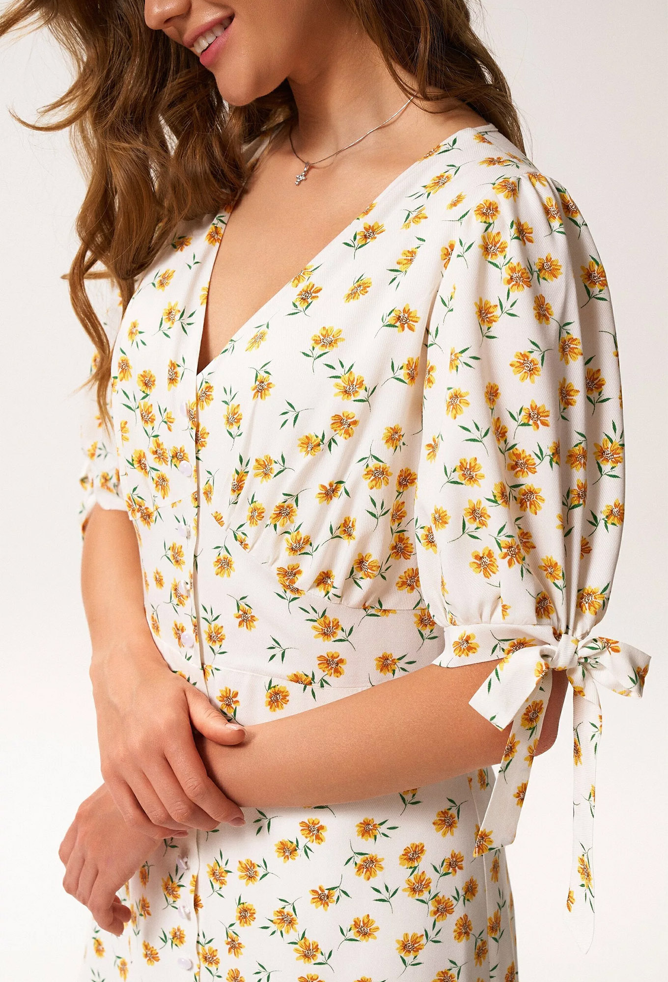 Нежное женское платья прилегающего силуэта, отрезное по линии талии. Перед с фигурной кокеткой и сборкой под грудью. Юбка конической формы длиной ниже линии колена. Вырез горловины глубокий. V-образный. Рукав втачной со сборкой по линии отката и низу. Манжет притачной с завязкой на бант. Платье с застежкой на петли и пуговицы.