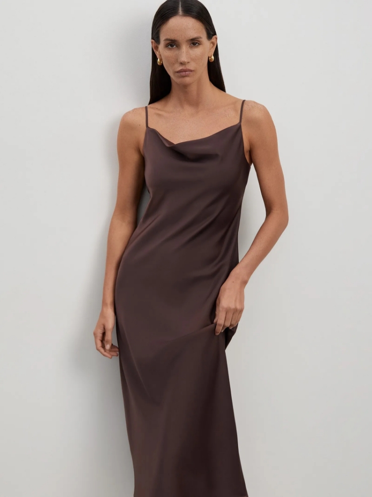 Платье-комбинация в цвете горького шоколада. Выполнено из струящегося материала с содержанием вискозы. Платье на тонких бретелях эффектно открывает спину. Акцент на зоне декольте создаёт вырез-качелька. Модель приталенного силуэта в длине миди выгодно подчеркнёт фигуру. Подойдёт для праздника и творческих мероприятий, а также впишется в повседневные образы в паре с жакетом или кардиганом. Платье можно стилизовать с объёмным кардиганом и обувью на плоском ходу или с однотонным жакетом и босоножками на высоком каблуке