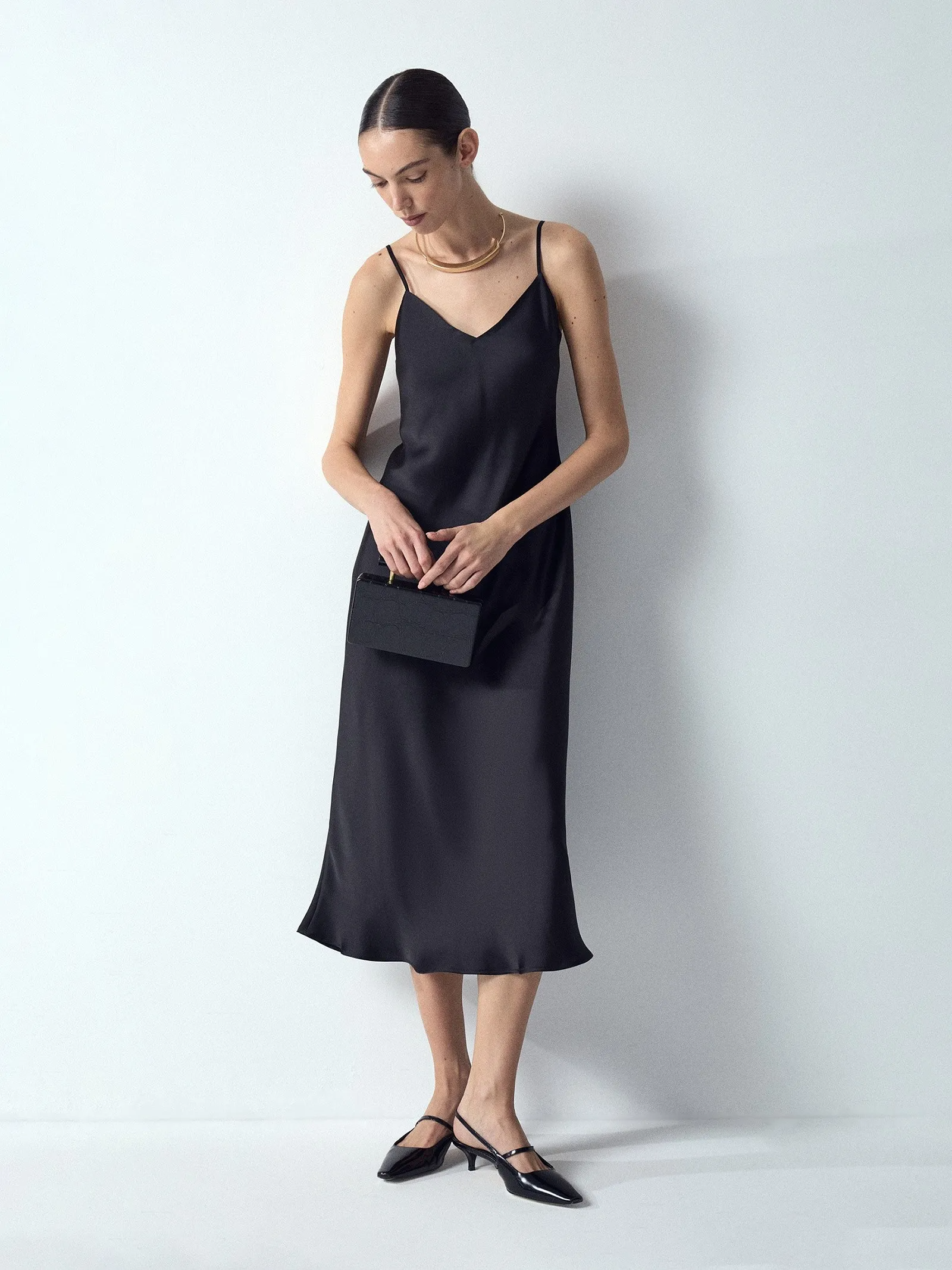 Приталенная комбинация с треугольным вырезом выполнена из глянцевитого материала в чёрном цвете. Модель на тонких бретелях подчеркнет красоту зоны декольте, шеи и плеч. Длина миди располагает к сочетанию с обувью на высоком каблуке. Платье подходит для создания праздничных образов. В повседневных будет выигрышно смотреться с разнообразными жакетами и куртками, в том числе из кожи и экокожи. Выполнено без подкладки.
