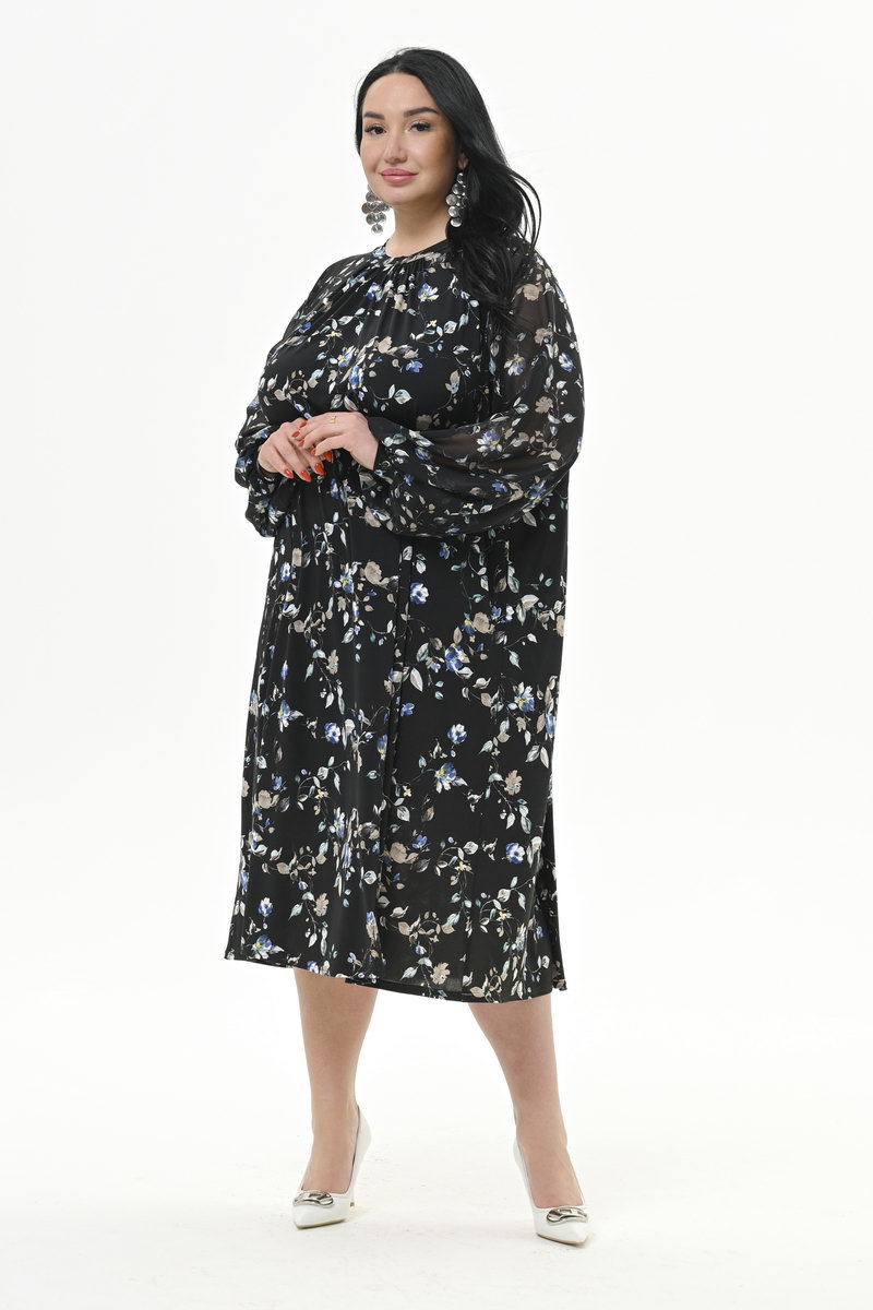 Платье комбинированное, масло/шифон, черное с бирюзовыми цветами *