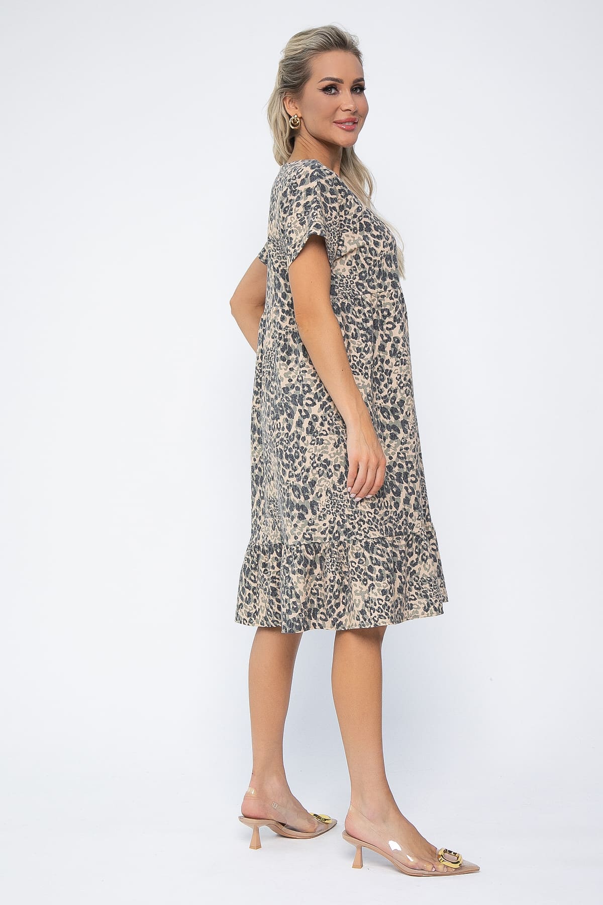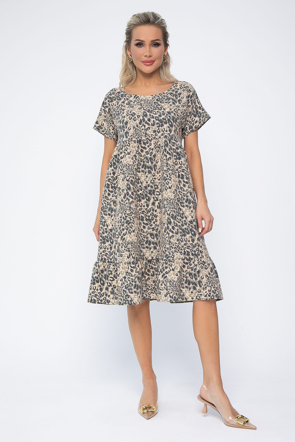 Платье свободного кроя с леопардовым принтом — это смелый и стильный элемент гардероба, который привлечет внимание и подчеркнёт вашу уникальность. Леопардовый принт добавляет дерзости и выразительности, помогая выделиться из толпы. Округлая горловина, обработанная обтачкой, придаёт платью аккуратный и завершённый вид. Двухъярусный подол добавляет образу лёгкость и игривость.