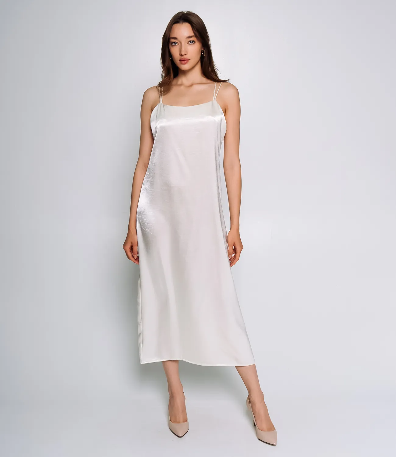 Элегантное платье, выполненное из 100% полиэстера с атласным эффектом, что придаёт изделию гладкую, блестящую поверхность и лёгкий перелив ткани при движении. Платье имеет прямой силуэт, который свободно ниспадает по фигуре, подчеркивая утонченность и элегантность образа. Длина платья достигает примерно середины икр, что создаёт баланс между изяществом и практичностью. Особенностью модели являются тонкие двойные бретели, которые аккуратно располагаются на плечах, придавая лёгкость и воздушность образу. Линия выреза — прямоугольная по переду, без дополнительных украшений или драпировок, что усиливает минималистичный и современный стиль. Платье не имеет застёжек, карманов или других декоративных элементов, вся его привлекательность сосредоточена в простом, классическом крое и блеске ткани. Такое платье идеально подойдёт для вечерних мероприятий, торжеств или других случаев, когда требуется изысканный и стильный наряд. Рост 168, 85-63-92.