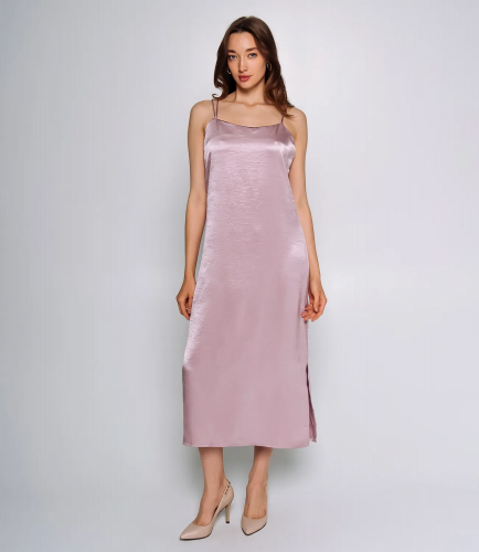 Элегантное платье, выполненное из 100% полиэстера с атласным эффектом, что придаёт изделию гладкую, блестящую поверхность и лёгкий перелив ткани при движении. Платье имеет прямой силуэт, который свободно ниспадает по фигуре, подчеркивая утонченность и элегантность образа. Длина платья достигает примерно середины икр, что создаёт баланс между изяществом и практичностью. Особенностью модели являются тонкие двойные бретели, которые аккуратно располагаются на плечах, придавая лёгкость и воздушность образу. Линия выреза — прямоугольная по переду, без дополнительных украшений или драпировок, что усиливает минималистичный и современный стиль. Платье не имеет застёжек, карманов или других декоративных элементов, вся его привлекательность сосредоточена в простом, классическом крое и блеске ткани. Такое платье идеально подойдёт для вечерних мероприятий, торжеств или других случаев, когда требуется изысканный и стильный наряд. Рост 168, 85-63-92.