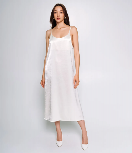 Элегантное платье, выполненное из 100% полиэстера с атласным эффектом, что придаёт изделию гладкую, блестящую поверхность и лёгкий перелив ткани при движении. Платье имеет прямой силуэт, который свободно ниспадает по фигуре, подчеркивая утонченность и элегантность образа. Длина платья достигает примерно середины икр, что создаёт баланс между изяществом и практичностью. Особенностью модели являются тонкие бретели, которые аккуратно располагаются на плечах, придавая лёгкость и воздушность образу. Линия выреза — округлая, без дополнительных украшений или драпировок, что усиливает минималистичный и современный стиль. Платье не имеет застёжек, карманов или других декоративных элементов, вся его привлекательность сосредоточена в простом, классическом крое и блеске ткани. Такое платье идеально подойдёт для вечерних мероприятий, торжеств или других случаев, когда требуется изысканный и стильный наряд. Рост 168, 85-63-92.