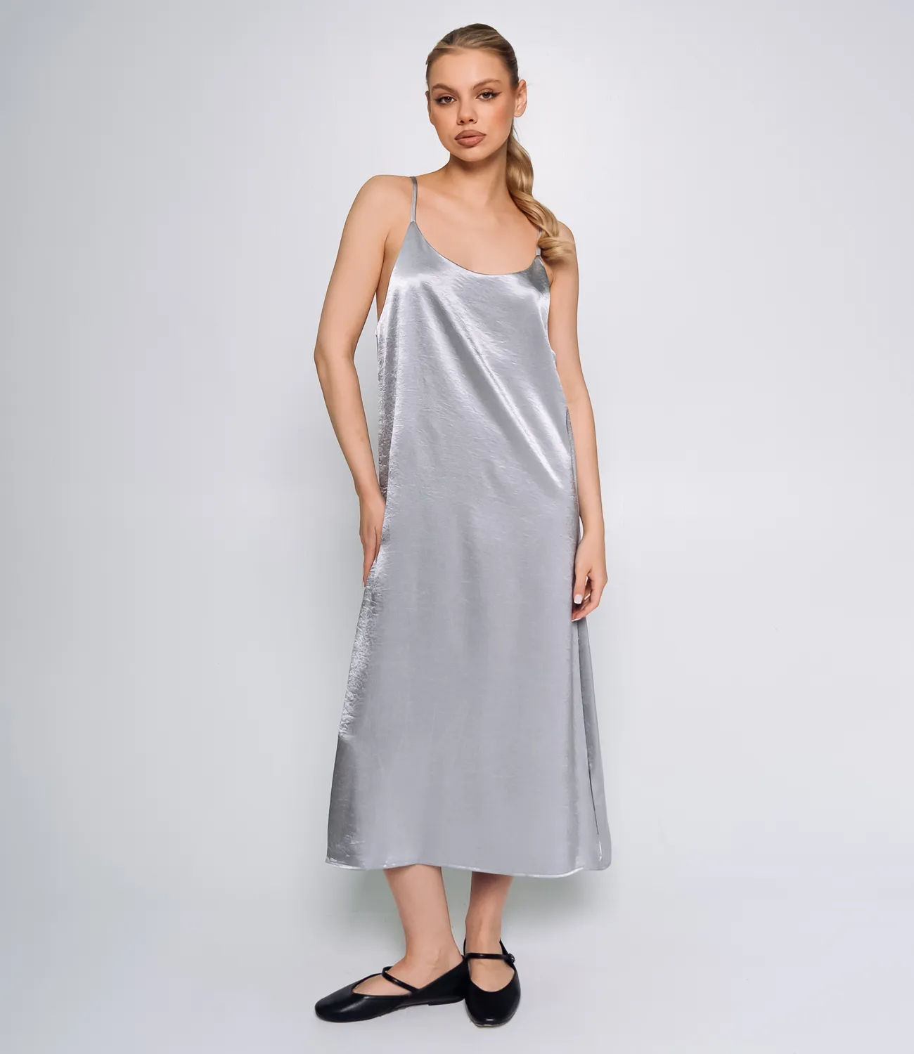 Элегантное платье, выполненное из 100% полиэстера с атласным эффектом, что придаёт изделию гладкую, блестящую поверхность и лёгкий перелив ткани при движении. Платье имеет прямой силуэт, который свободно ниспадает по фигуре, подчеркивая утонченность и элегантность образа. Длина платья достигает примерно середины икр, что создаёт баланс между изяществом и практичностью. Особенностью модели являются тонкие бретели, которые аккуратно располагаются на плечах, придавая лёгкость и воздушность образу. Линия выреза — округлая, без дополнительных украшений или драпировок, что усиливает минималистичный и современный стиль. Платье не имеет застёжек, карманов или других декоративных элементов, вся его привлекательность сосредоточена в простом, классическом крое и блеске ткани. Такое платье идеально подойдёт для вечерних мероприятий, торжеств или других случаев, когда требуется изысканный и стильный наряд. Рост 168 см, 89-63-90.