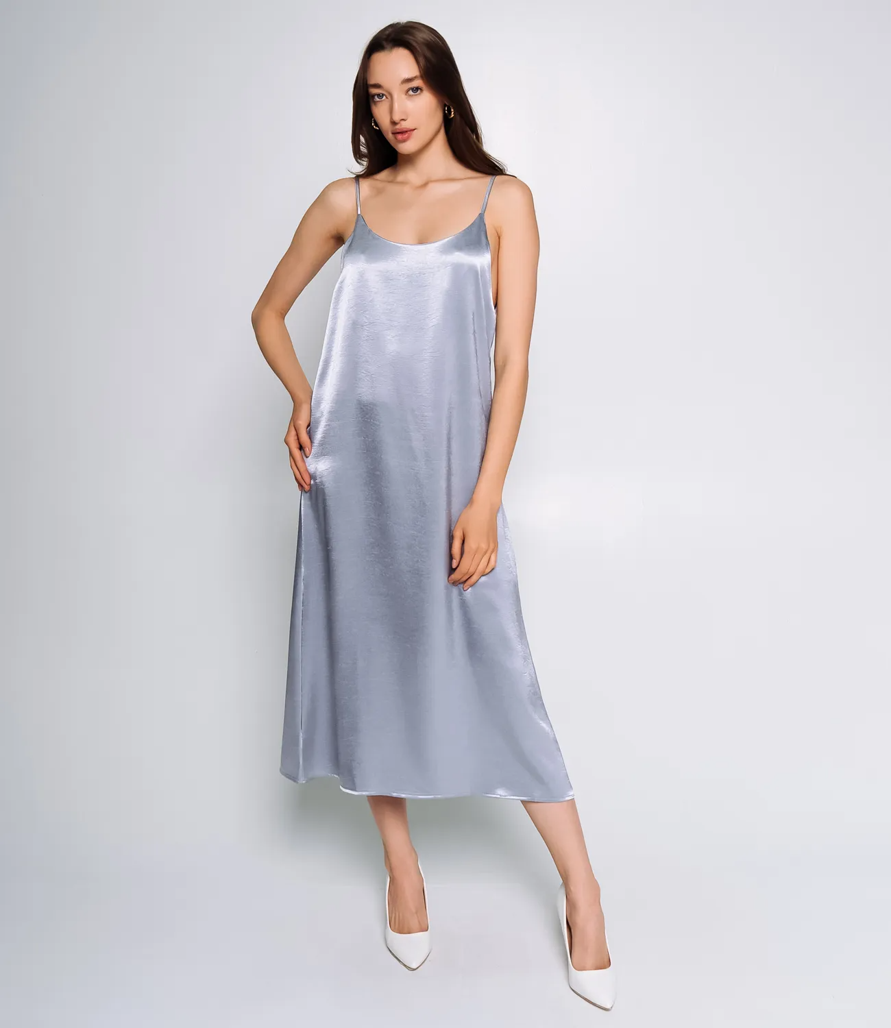 Элегантное платье, выполненное из 100% полиэстера с атласным эффектом, что придаёт изделию гладкую, блестящую поверхность и лёгкий перелив ткани при движении. Платье имеет прямой силуэт, который свободно ниспадает по фигуре, подчеркивая утонченность и элегантность образа. Длина платья достигает примерно середины икр, что создаёт баланс между изяществом и практичностью. Особенностью модели являются тонкие бретели, которые аккуратно располагаются на плечах, придавая лёгкость и воздушность образу. Линия выреза — округлая, без дополнительных украшений или драпировок, что усиливает минималистичный и современный стиль. Платье не имеет застёжек, карманов или других декоративных элементов, вся его привлекательность сосредоточена в простом, классическом крое и блеске ткани. Такое платье идеально подойдёт для вечерних мероприятий, торжеств или других случаев, когда требуется изысканный и стильный наряд. Рост 168, 85-63-92.