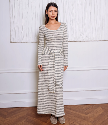 Платье – это вещь, которая подчеркивает женственность каждой представительницы прекрасного пола.Платье в длине макси с приталенным лифом и расклёшенной юбкой, выполнено в полосатой фактуре с равномерно повторяющимися горизонтальными полосами. Вырез горловины широкий и слегка округлый, плотно обработан узкой отделочной планкой; линия плеч плавная, рукава длинные и узкие, плотно облегают руки до запястий. На уровне талии присутствует мягкий пояс из той же ткани, свободно завязывающийся и формирующий легкую драпировку по передней части платья, подчёркивающую талию. Для изготовления использована ткань 65% хлопок и 35% полиэстер, которая характеризуется отличным качеством. Даже после многих стирок платье не потеряет изначальной красоты. Вы обязательно будете его носить с удовольствием. Обратите внимание на цвет джинсового платья. Он является насыщенным и полностью соответствует фото на сайте. Чтобы вы были уверены в размере, мы предоставили на сайте таблицу. Воспользовавшись ею, вы сможете самостоятельно обмерить себя и удостовериться. Установленная нами цена является приемлемой. Не откажите себе в удовольствии быть неповторимой! Рост модели 164 см., 83-61-89.