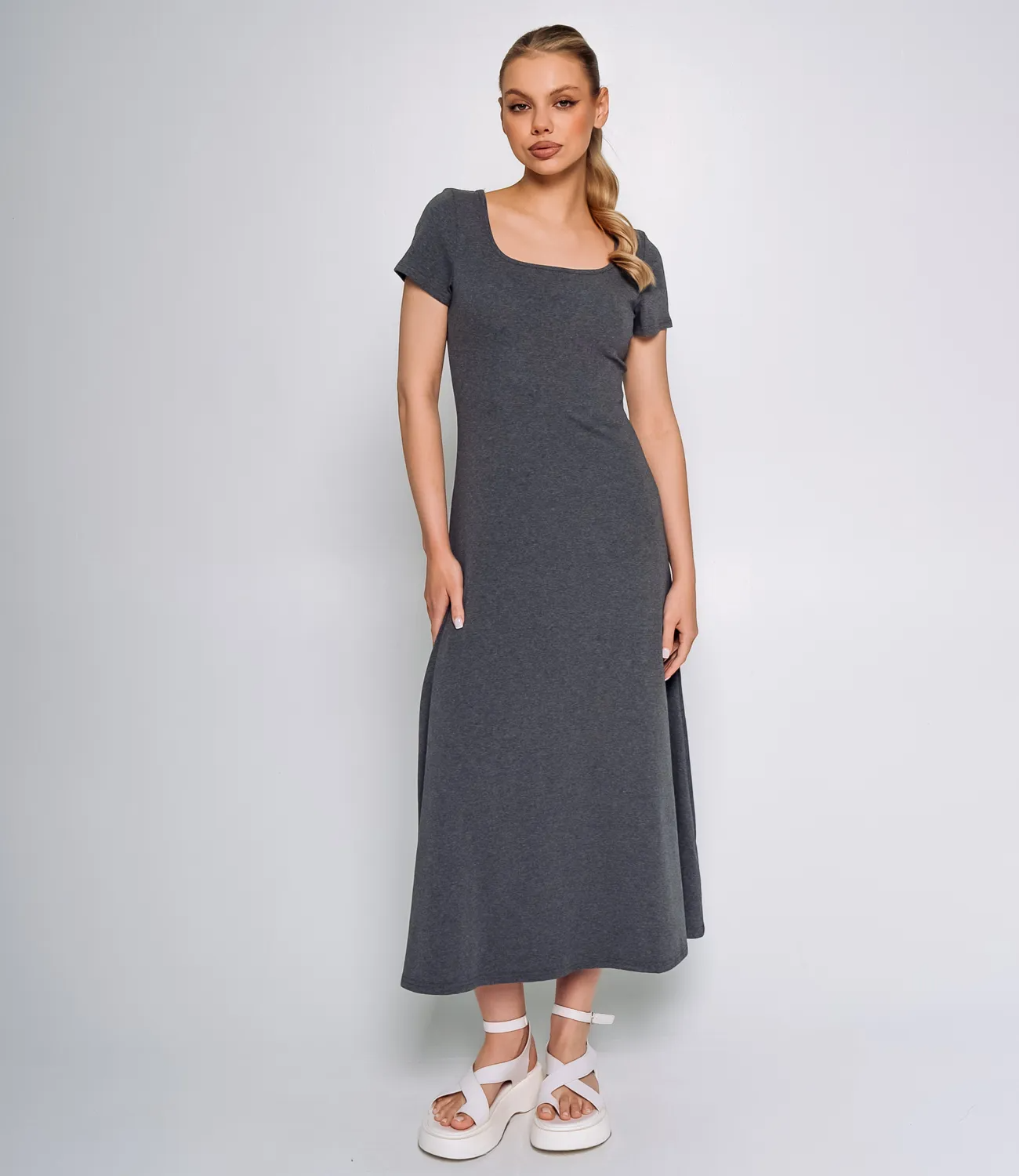 Платье выполнено из мягкой и приятной к телу ткани, состоящей из 97% хлопка и 3% спандекса, что обеспечивает легкую эластичность и комфорт при носке, а также хорошую посадку по фигуре. Модель имеет облегающий силуэт, который подчеркивает формы, при этом благодаря добавлению спандекса платье не стесняет движений. Длина платья — макси, оно достигает щиколоток. Вырез горловины широкий, квадратной формы, что придает образу изысканность и женственность. Рукава короткие, плотно прилегающие, что гармонирует с общим силуэтом и создает сбалансированный вид. Кромка изделия чуть расширяется книзу, создавая легкие плавные движения ткани при ходьбе. Отсутствие дополнительных декоративных элементов делает платье минималистичным и универсальным для разных образов и ситуаций. Привлекательная цена делает егодоступными для оптовых покупателей, что позволит удовлетворить потребности вашей клиентской базы. Подарите своим клиентам возможность наслаждаться стилем и комфортом в этом замечательном платье! Рост 168 см, 89-63-90.