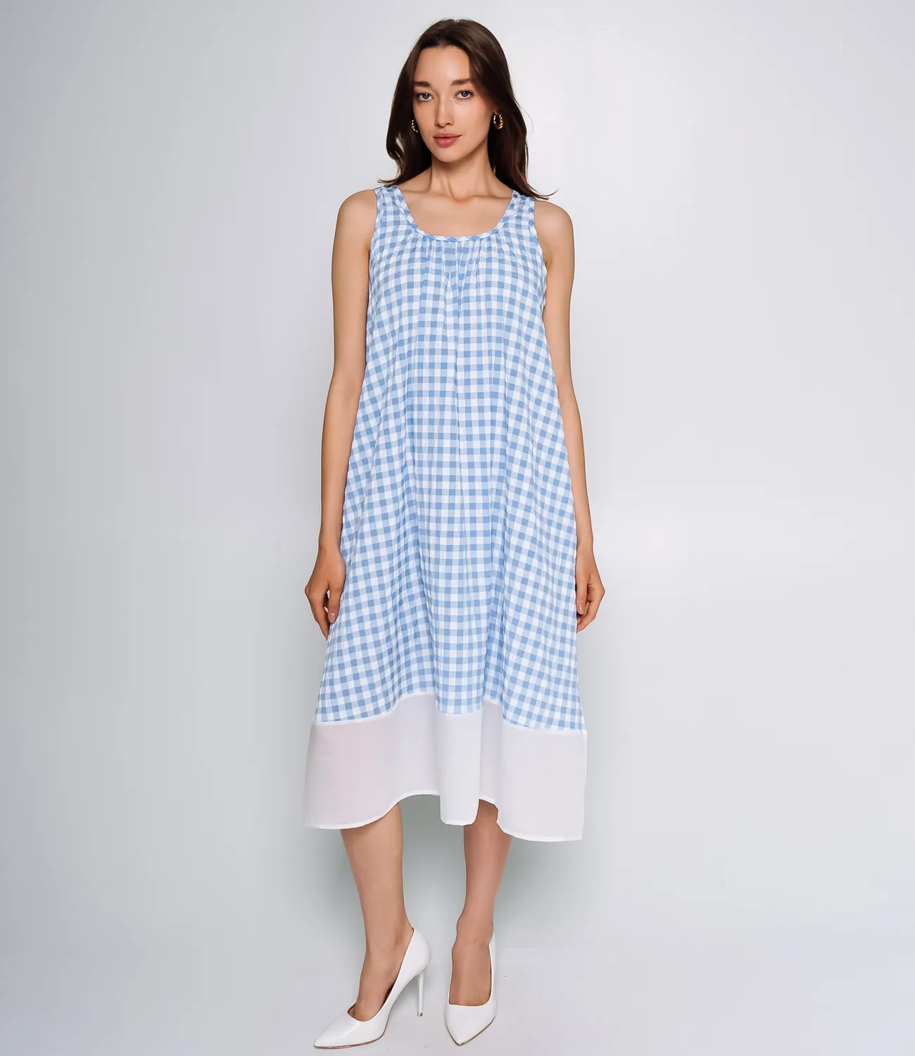 Платье выполнено из 100% полиэстера, что придаёт ткани легкость и комфорт, а также обеспечивает простоту ухода за изделием. Модель имеет свободный силуэт, который не сковывает движения и подходит для повседневной носки. Верхняя часть платья оформлена круглыми проймами и округлым вырезом горловины, придающим изделию мягкость и женственность. Основная часть платья украшена узором в форме мелкой клеточки, что добавляет ему свежести и легкости. Платье имеет длину ниже колена, и внизу выполнена широкая отделка из ткани без узора, создающая визуальное разделение и добавляющая интересный акцент к изделию. Кромка платья ровная, без дополнительной отделки. Эта модель отлично подойдет для теплой погоды, сочетая в себе практичность и стиль благодаря лаконичному крою и мягкой структуре ткани. Привлекательная цена делает его доступными для оптовых покупателей, что позволит удовлетворить потребности вашей клиентской базы. Подарите своим клиентам возможность наслаждаться стилем и комфортом этом замечательном платье!! Рост 168, 85-63-92.