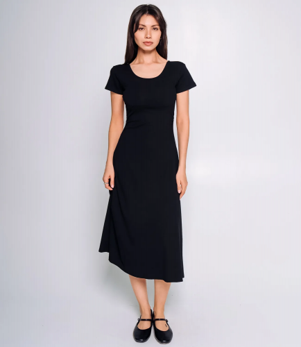 Платье выполнено из 65% хлопка, 30% полиэстера и 5% эластана, что придает ткани легкость, воздушность и приятное шелковистое ощущение при соприкосновении с кожей. Платье длиной миди, облегающего силуэта. Оно имеет круглый вырез горловины и короткие, втачные рукава. Верхняя часть платья, до линии бедер, плотно облегает фигуру, подчеркивая силуэт. Нижняя часть расклешенная, плавно расширяется от бедра книзу, создавая легкий и женственный A-силуэт. Ткань платья, скорее всего, мягкая и эластичная, что обеспечивает комфортную посадку. Особенностью платья является небольшой вырез на спине, украшенный несколькими аккуратными бантами. Это добавляет образу кокетливости и оригинальности, делая акцент на спине. Благодаря простому крою, минималистичному дизайну и деликатной детали на спине, платье выглядит лаконично, но в то же время эффектно и универсально! Рост 164, 83-61-89. Вы можете заказать онлайн презентацию на интересующие Вас модели. Наши менеджеры свяжутся с Вами и проведут индивидуальную видеотрансляцию, помогут составить заказ и ответят на Ваши вопросы.