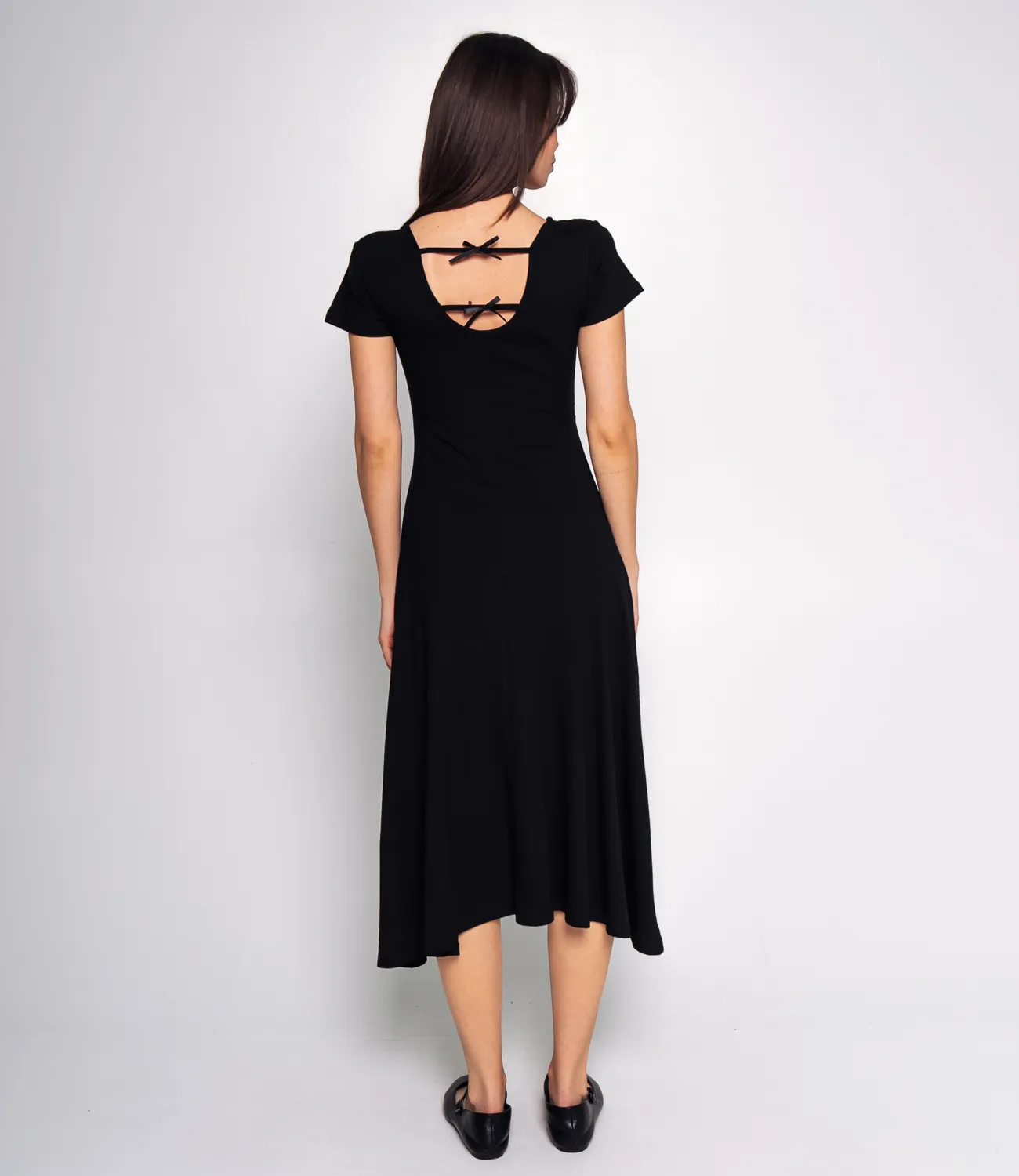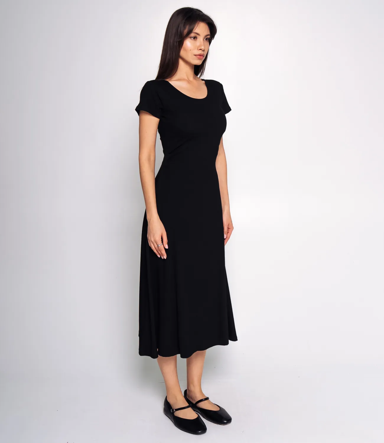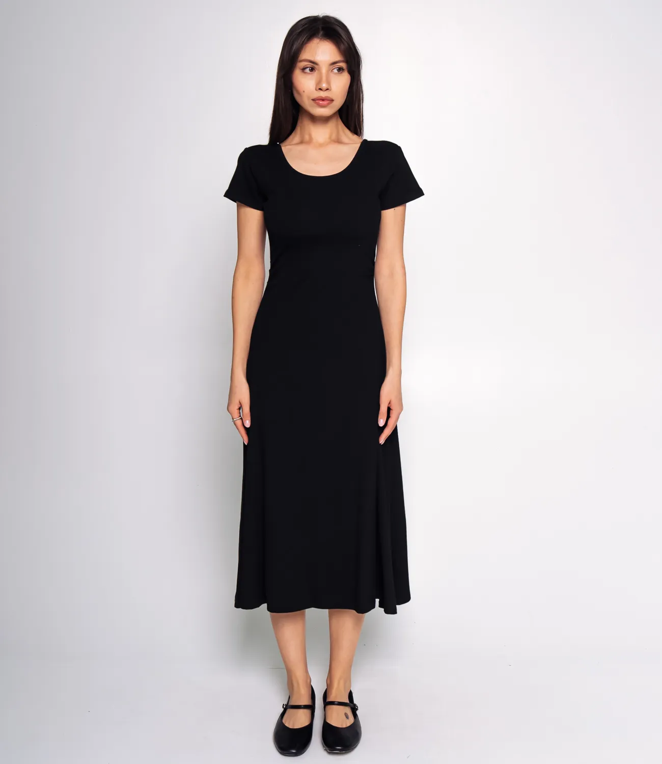 Платье выполнено из 65% хлопка, 30% полиэстера и 5% эластана, что придает ткани легкость, воздушность и приятное шелковистое ощущение при соприкосновении с кожей. Платье длиной миди, облегающего силуэта. Оно имеет круглый вырез горловины и короткие, втачные рукава. Верхняя часть платья, до линии бедер, плотно облегает фигуру, подчеркивая силуэт. Нижняя часть расклешенная, плавно расширяется от бедра книзу, создавая легкий и женственный A-силуэт. Ткань платья, скорее всего, мягкая и эластичная, что обеспечивает комфортную посадку. Особенностью платья является небольшой вырез на спине, украшенный несколькими аккуратными бантами. Это добавляет образу кокетливости и оригинальности, делая акцент на спине. Благодаря простому крою, минималистичному дизайну и деликатной детали на спине, платье выглядит лаконично, но в то же время эффектно и универсально! Рост 164, 83-61-89. Вы можете заказать онлайн презентацию на интересующие Вас модели. Наши менеджеры свяжутся с Вами и проведут индивидуальную видеотрансляцию, помогут составить заказ и ответят на Ваши вопросы.
