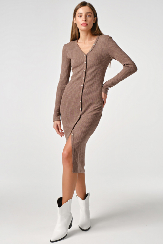 • Особенности: Платье прилегающего силуэта из фактурного трикотажа. Детали: V-образная горловина, фальш-планка по переду с имитацией застежки на пуговицы, разрез по переду. Без застежки.